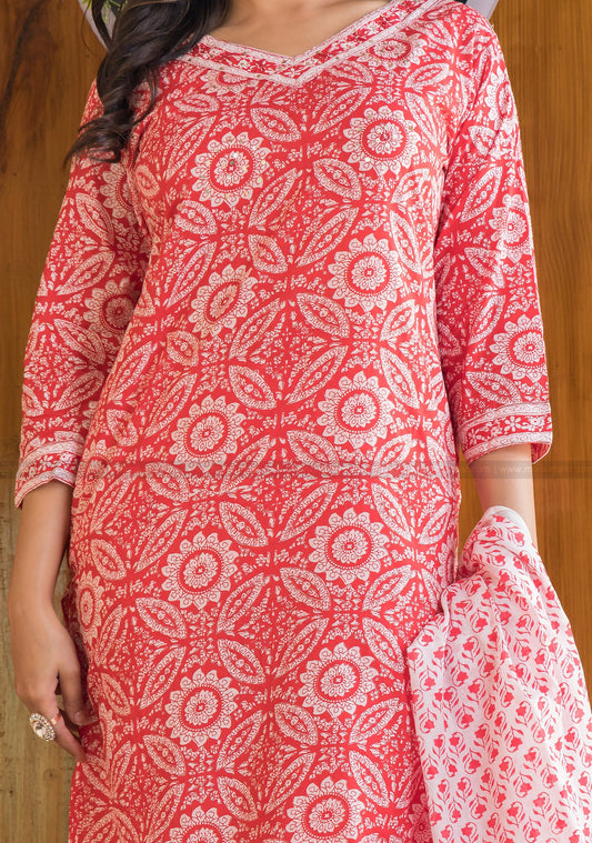 Courageous Red With Cute Pockets Cotton Kurti Set