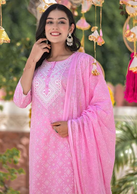 Sweet Pink Cotton Embroidered Suit Set