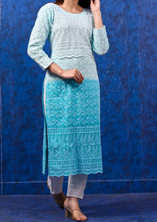 Inspiring Feroza Blue Double shaded Schiffli Chikankari suit set