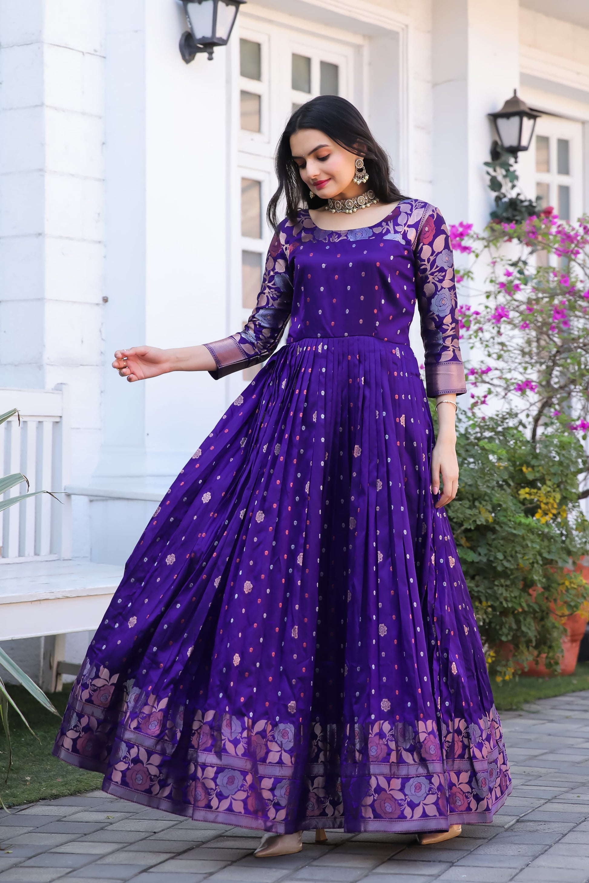 All Of Me Silk Gown Set allows you to express your timeless beauty. It is noted for its elegant and sophisticated appearance, which is achieved using the finest soft Silk fabric and copper weaving all over. Its easy-to-wear design makes it appropriate for any occasion. This traditional and elegant ornament will elevate your look.