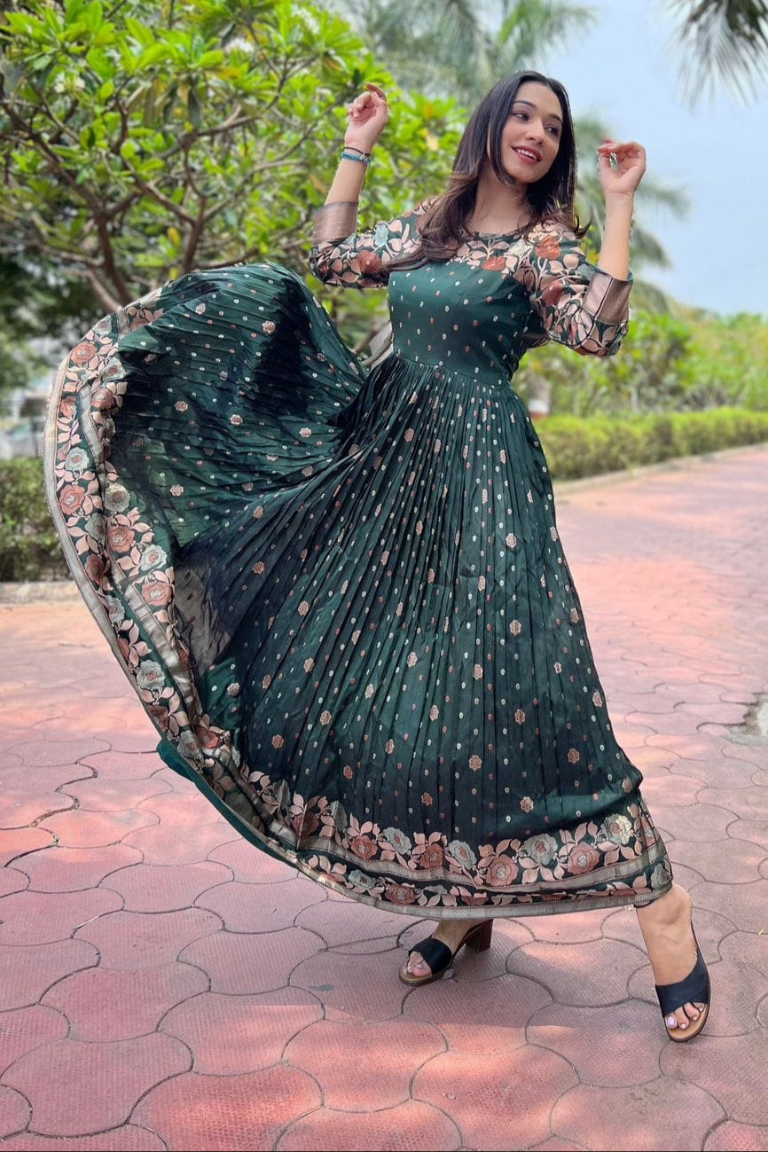 All Of Me Silk Gown Set allows you to express your timeless beauty. It is noted for its elegant and sophisticated appearance, which is achieved using the finest soft Silk fabric and copper weaving all over. Its easy-to-wear design makes it appropriate for any occasion. This traditional and elegant ornament will elevate your look.