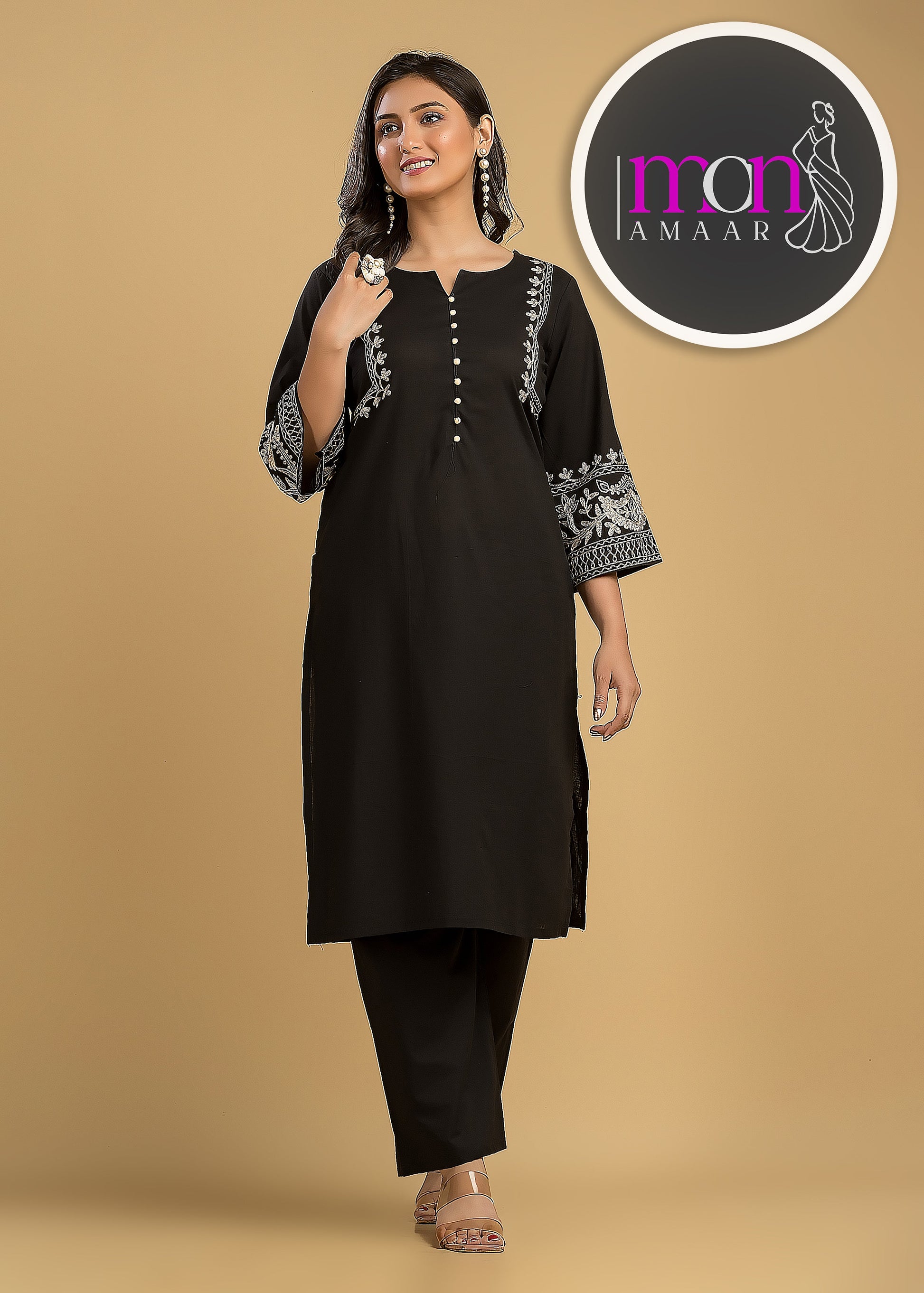 Get your hands on our beautiful black coord with intricate thread aari work detailing in bright tone perfect for any auspicious occasion.