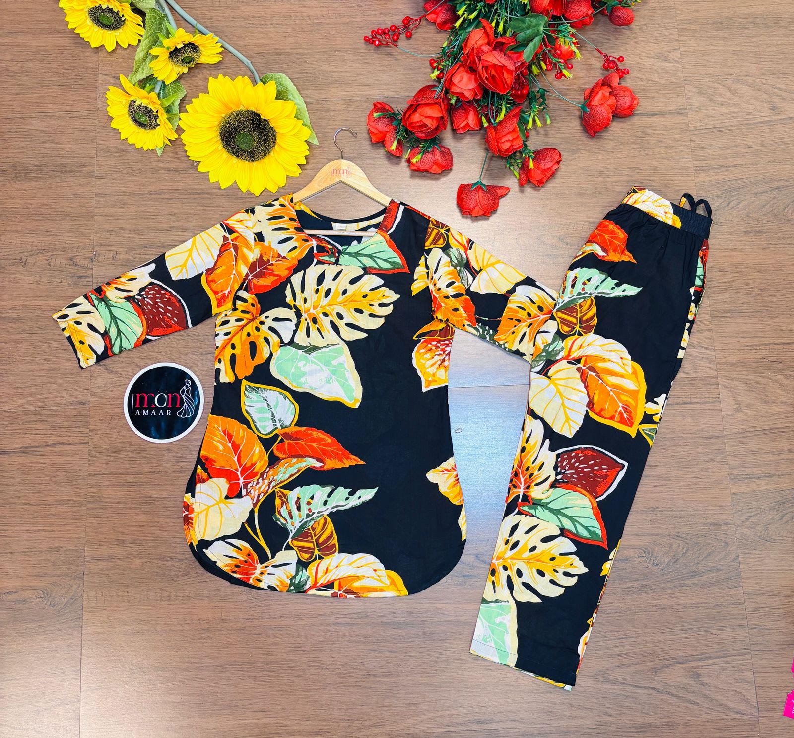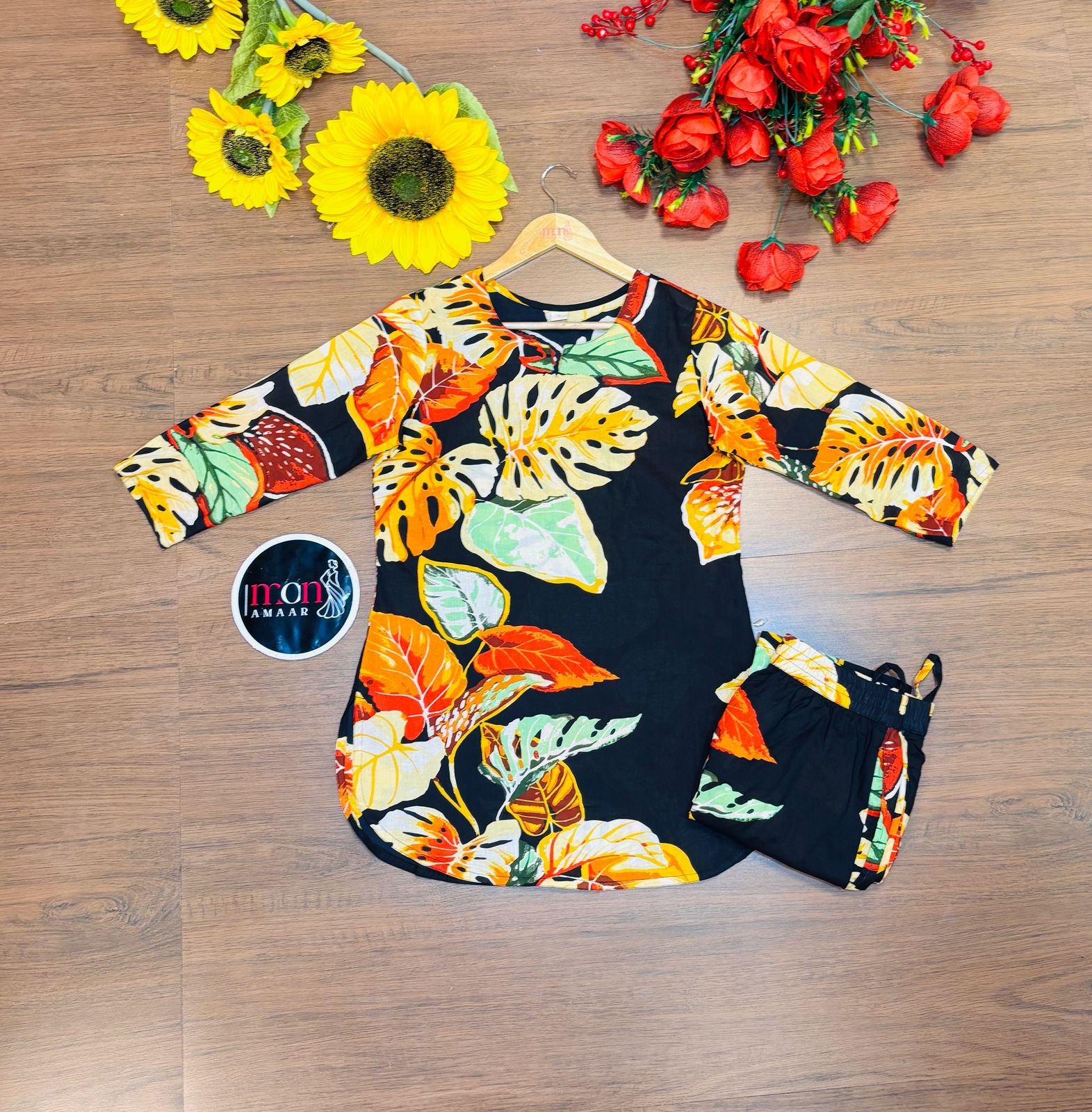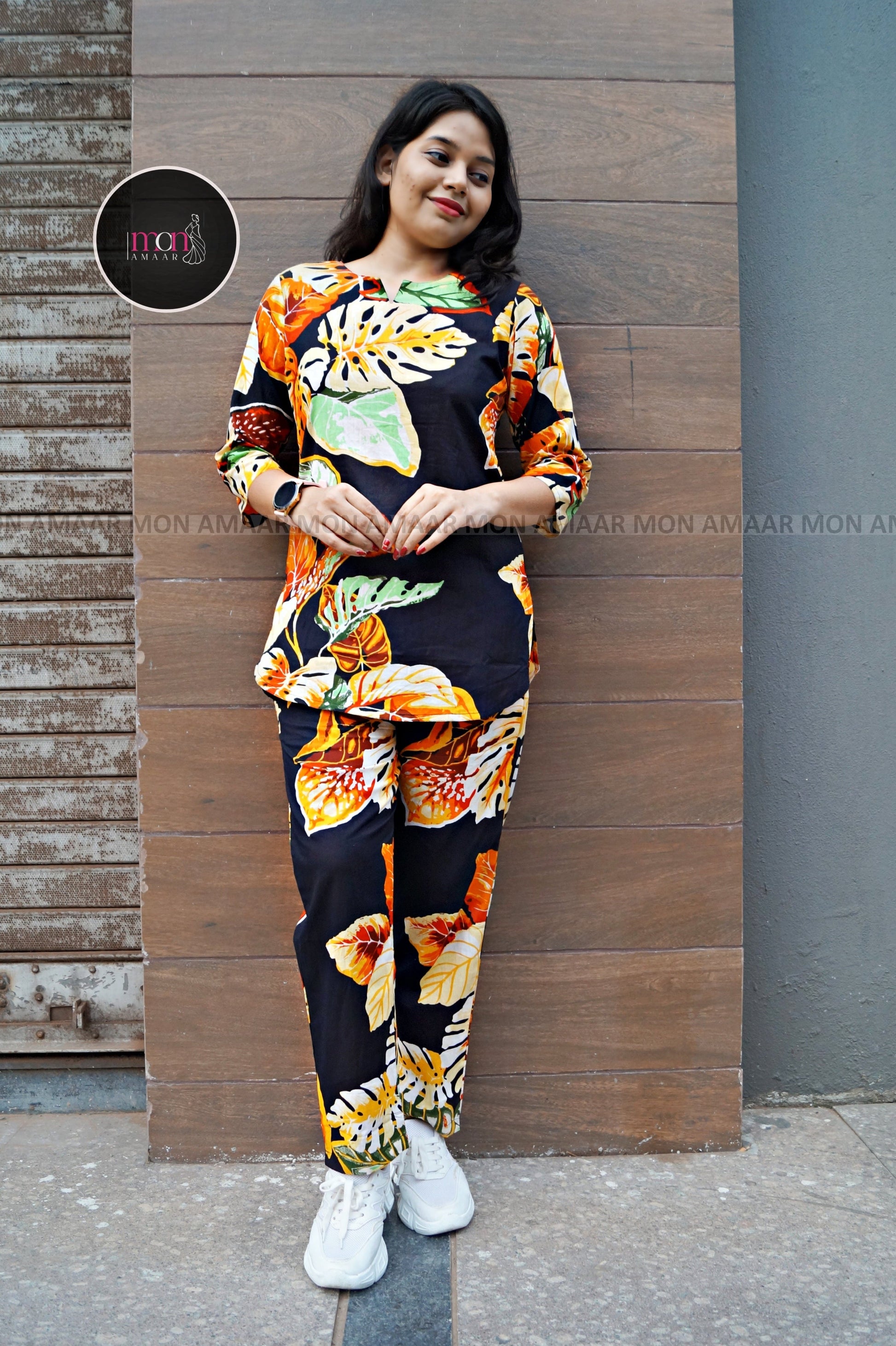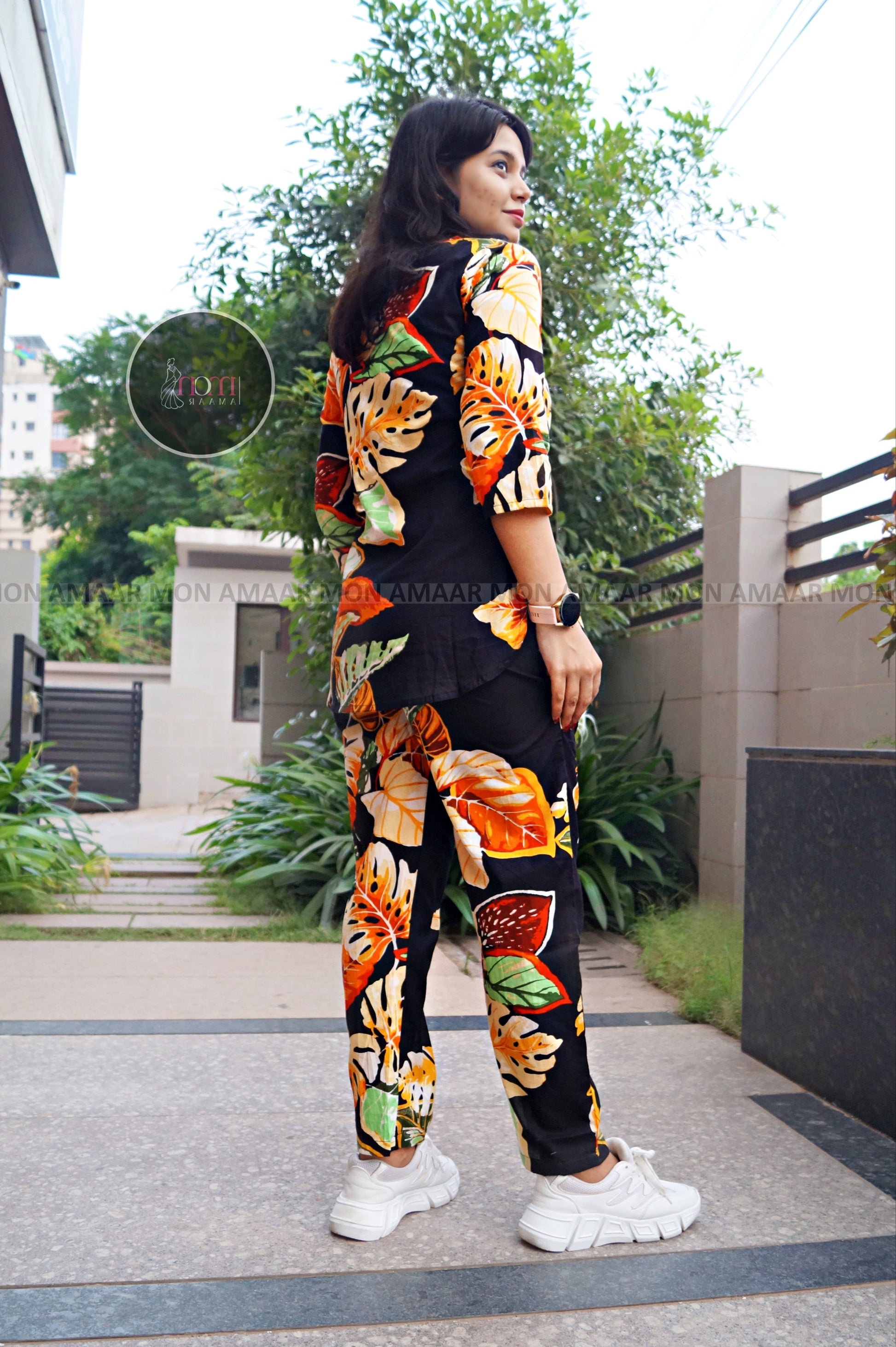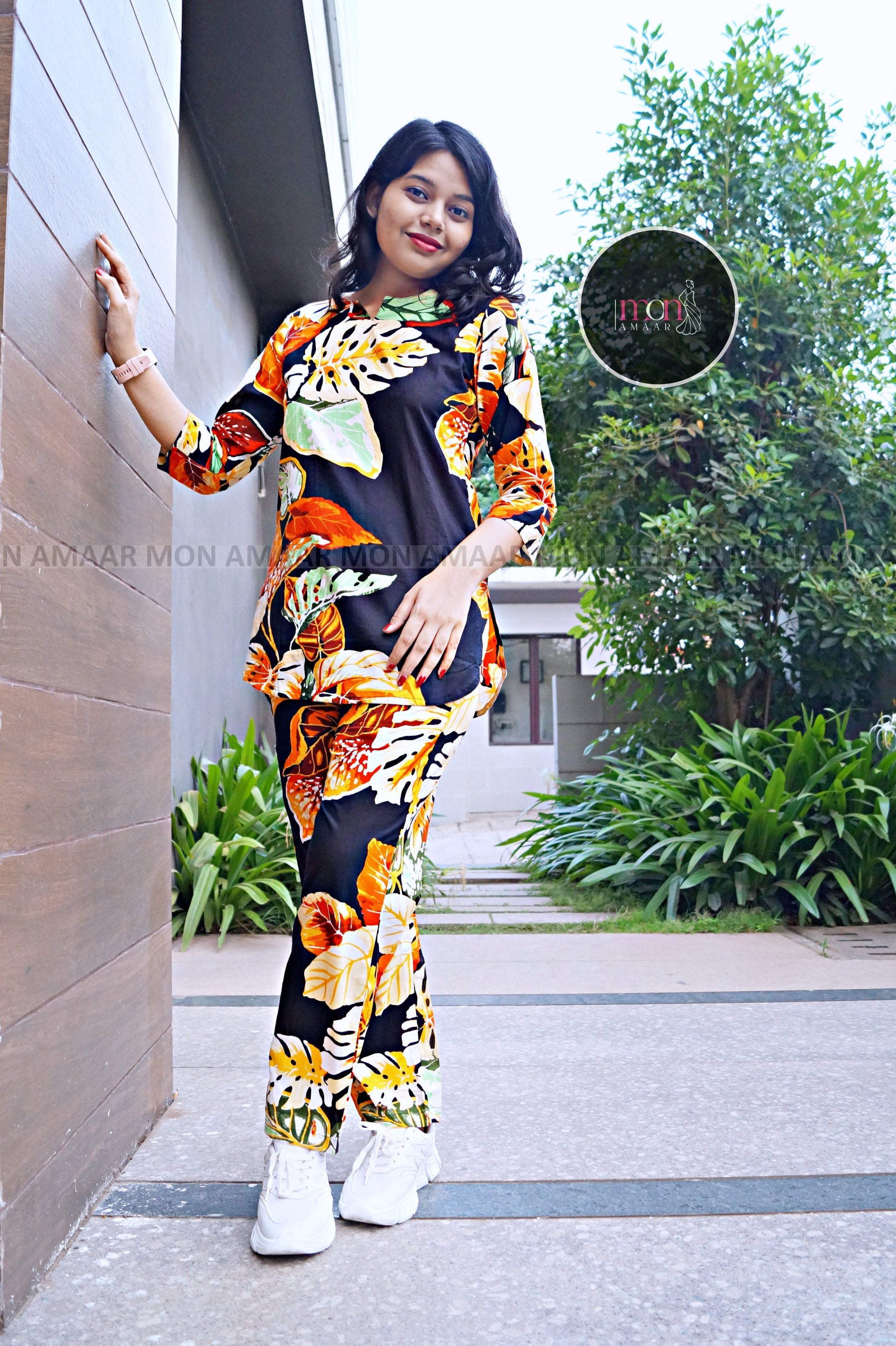 This Set features all over vibrant prints . Its Top and matching pant make it an eye-catching ,perfect for any occasion, Office wear, casual outings.