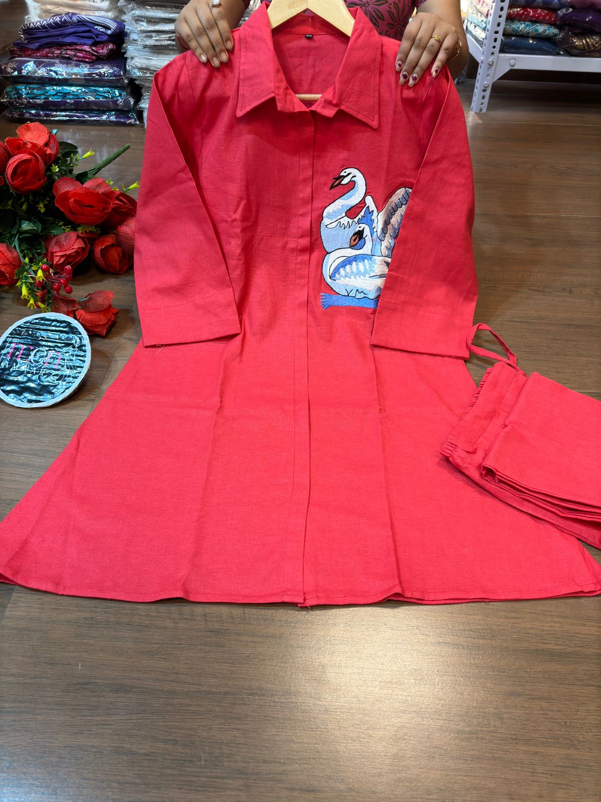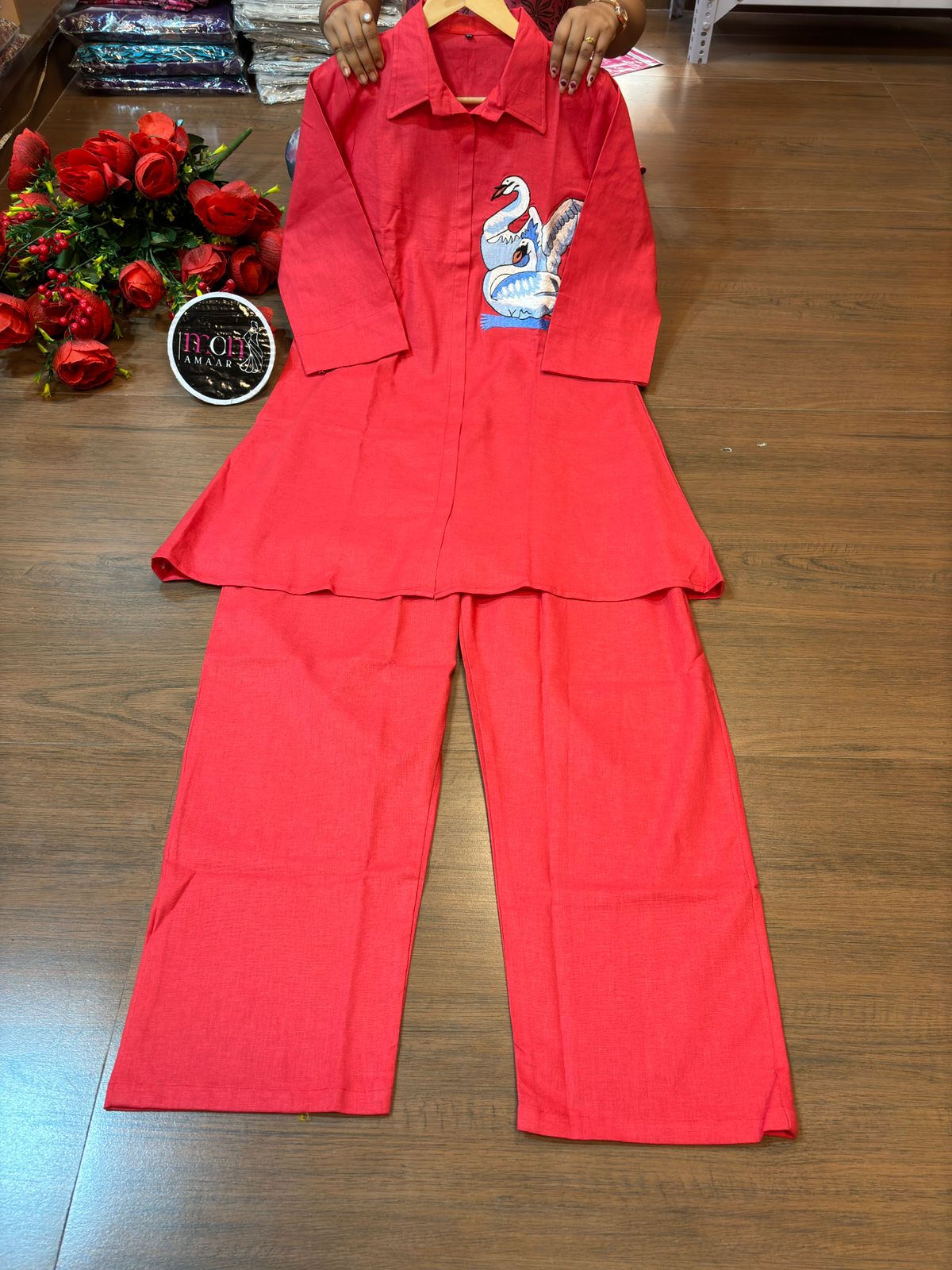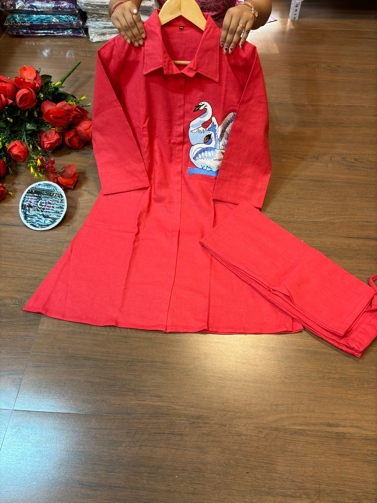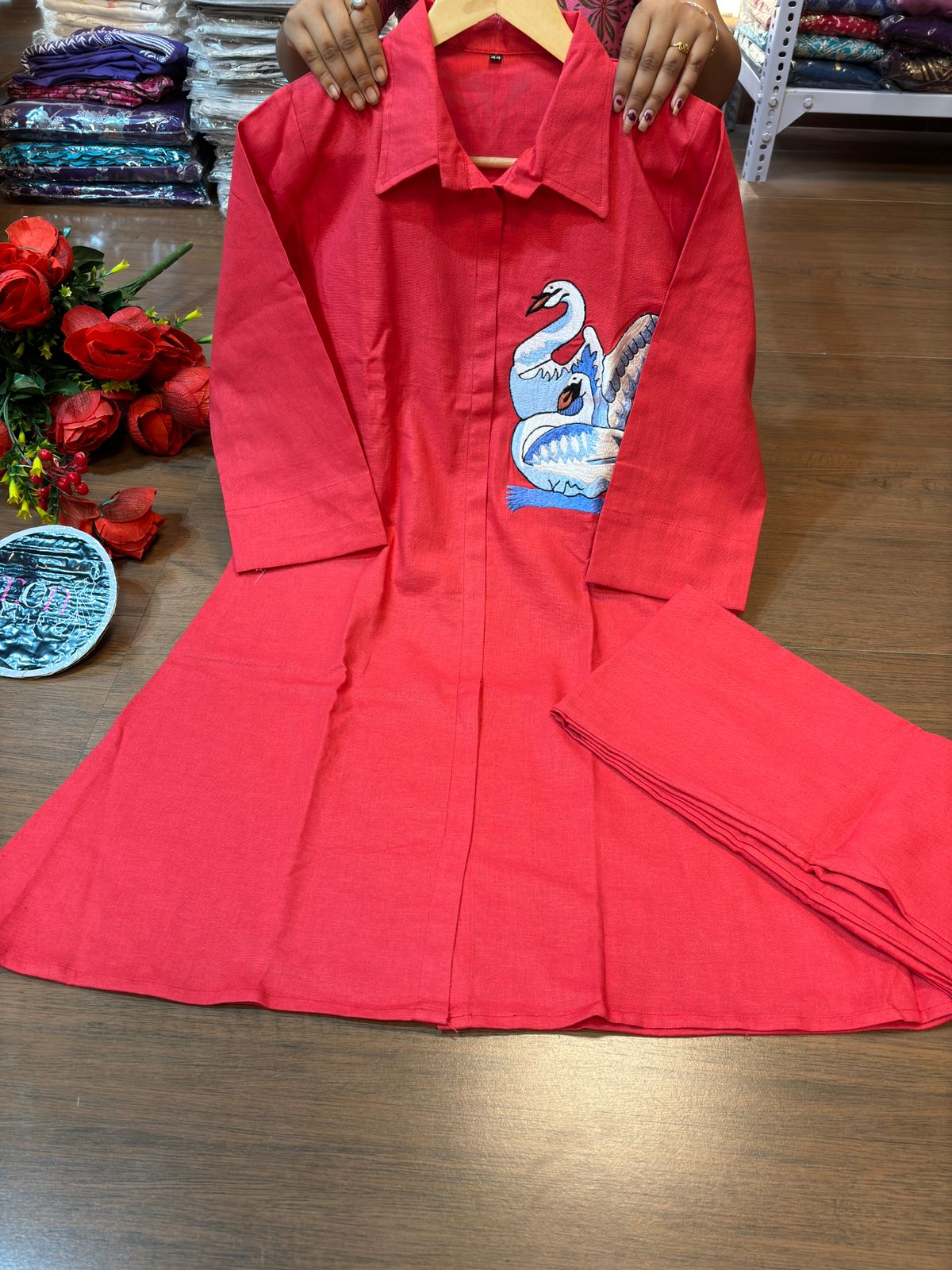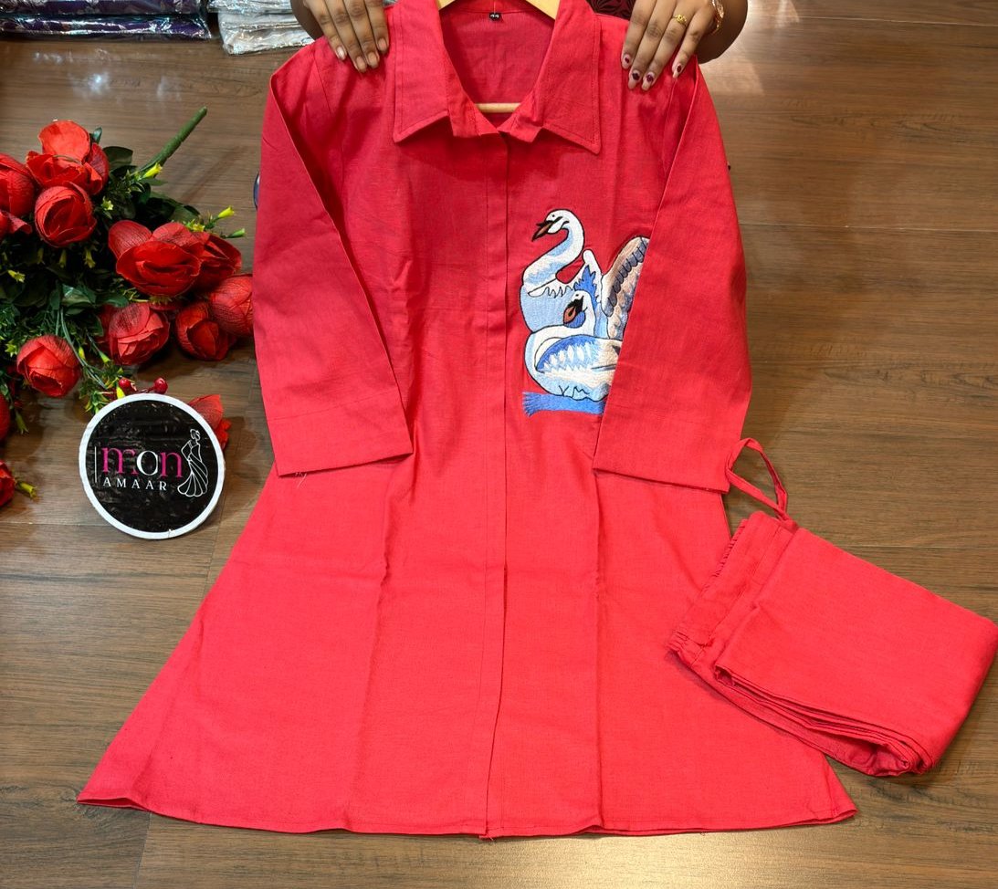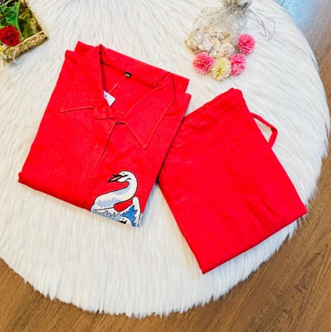 | New launch 💃coord - set for summer 🌞 Fabric: cotton with thread embroidery work 2p sets Front has cut style with swan design Paired up with cotton pant with pocket When it comes to comfort and style no one can beat look stylish and walk in comfort with our new summer COORD SET , perfect for your wardrobe This top has collar style neck It is Light , Non transparent anyone can carry it easily : breathable Best for summer or any parties , puja and more Cool and stylish Size: M to 3XL Top Length:37 inch or 93.98 cm approx. Bottom length: 38 inch or 96.52 cm approx.