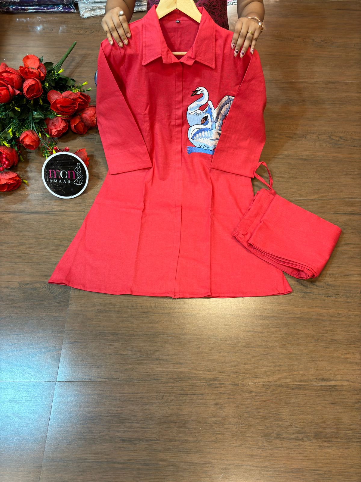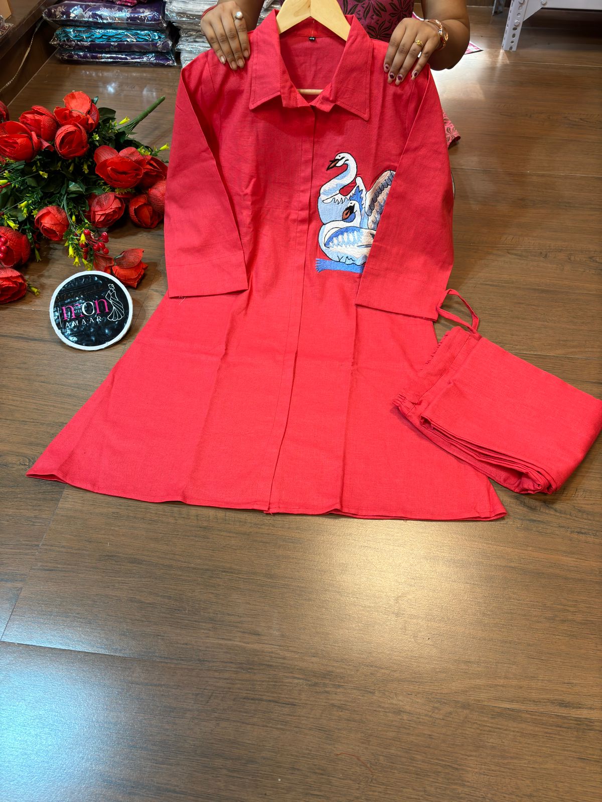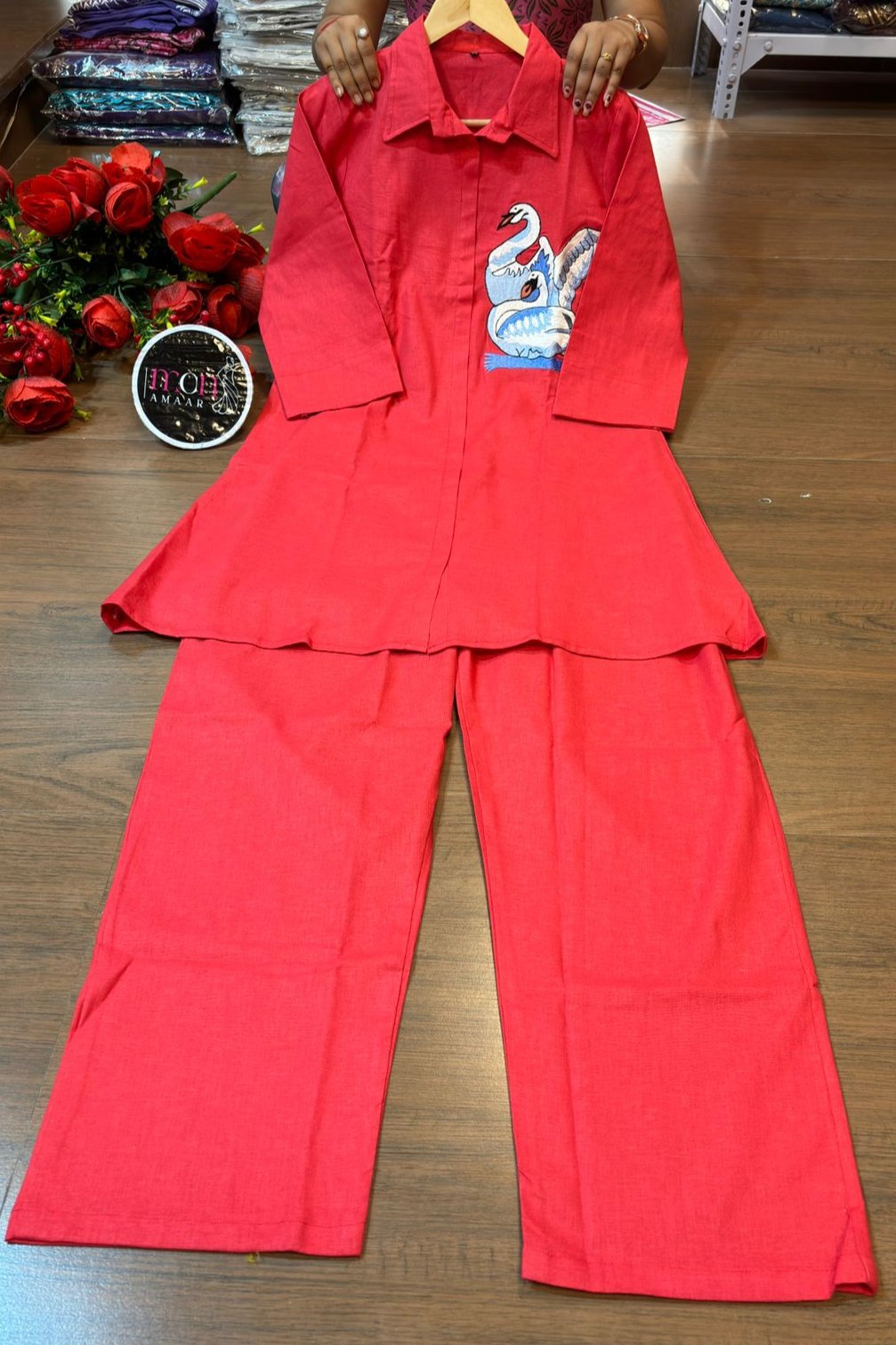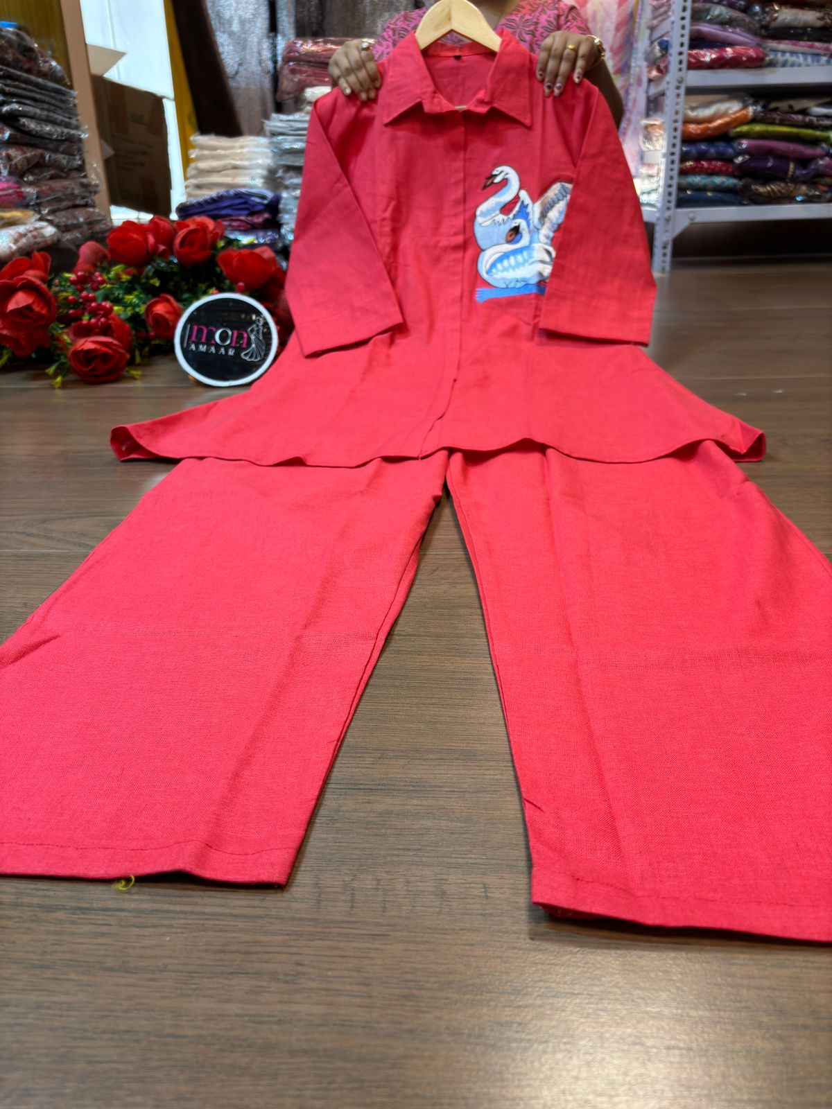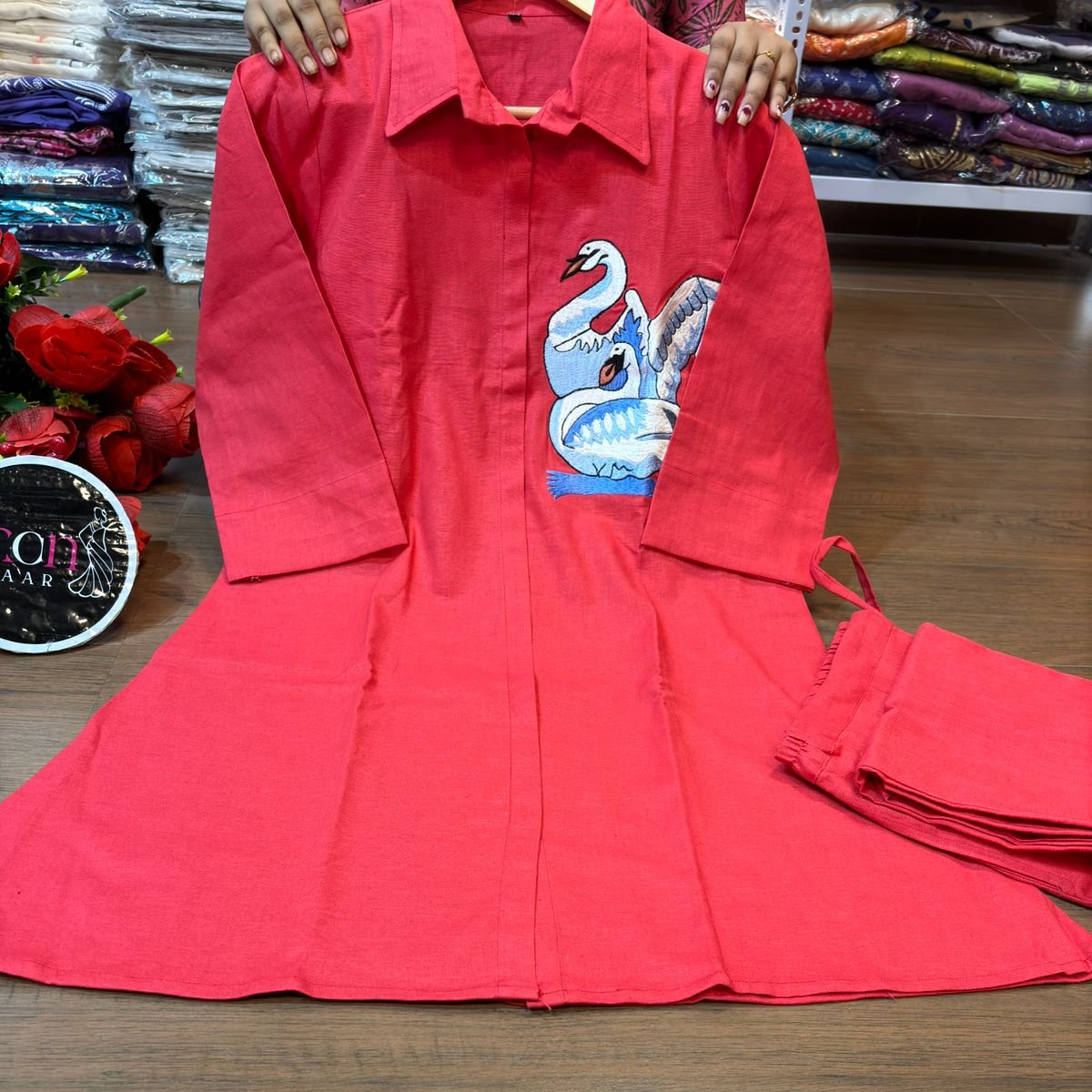 | New launch 💃coord - set for summer 🌞 Fabric: cotton with thread embroidery work 2p sets Front has cut style with swan design Paired up with cotton pant with pocket When it comes to comfort and style no one can beat look stylish and walk in comfort with our new summer COORD SET , perfect for your wardrobe This top has collar style neck It is Light , Non transparent anyone can carry it easily : breathable Best for summer or any parties , puja and more Cool and stylish Size: M to 3XL Top Length:37 inch or 93.98 cm approx. Bottom length: 38 inch or 96.52 cm approx.