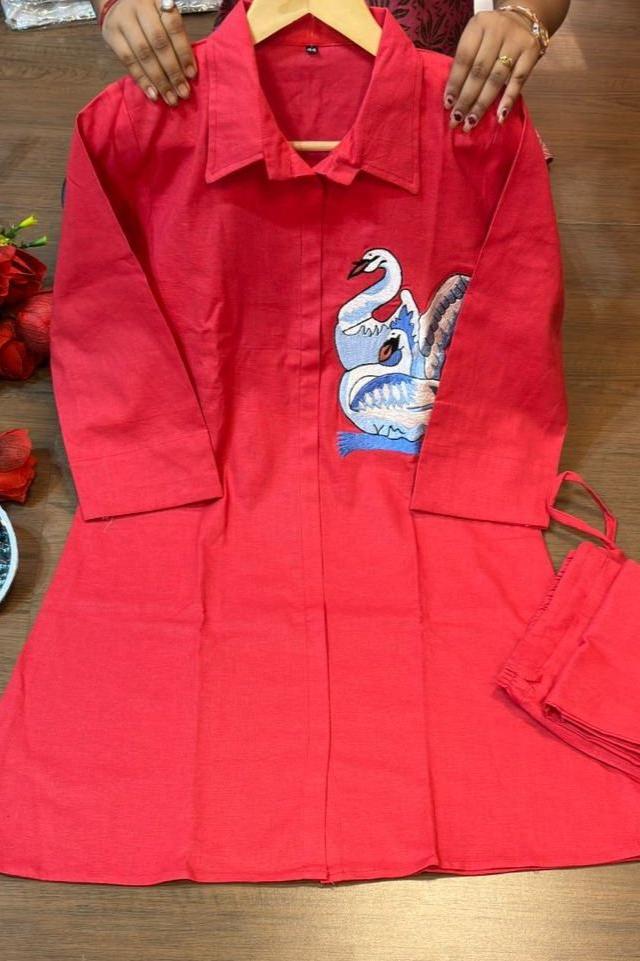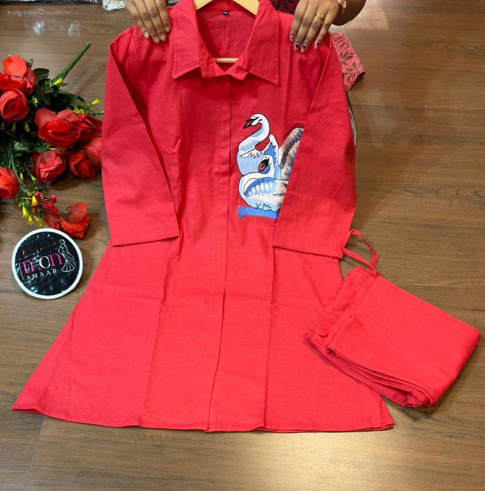 Welcoming our timeless classic for versatile elegance Feathery Friends Cotton Coord Set This stunning coord set features likes thread embroidery that is trendy and gorgeous. Made with high-quality cotton , this set is not only cool but also comfortable to wear. Elevate your style game with this must-have set!