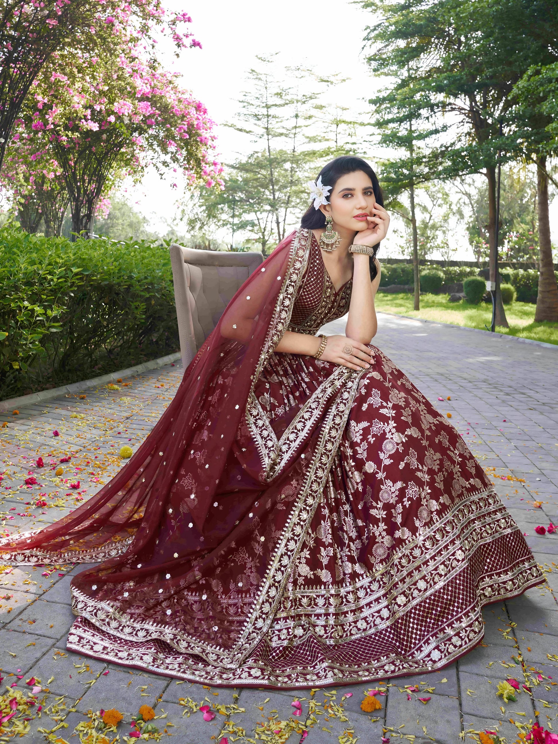 Unleash your inner boldness and stand out in the crowd Designer Dola Silk Lehenga ! These stunning ensembles are rich in color and feature stylish looks, making you the center of attention at every party and wedding. With this fancy silk [ blended ] fabric options to choose from, you can create a trendy and elegant look that is uniquely you. Get ready to stun in these gorgeous lehengas!