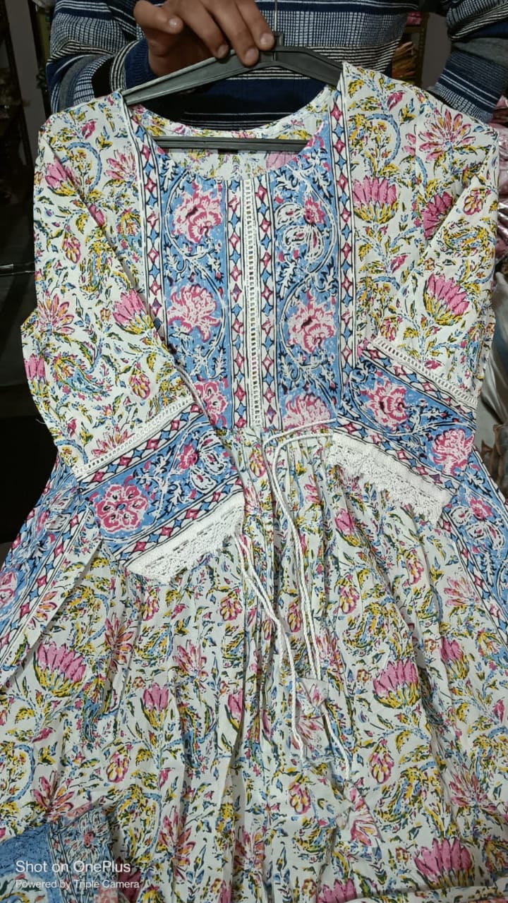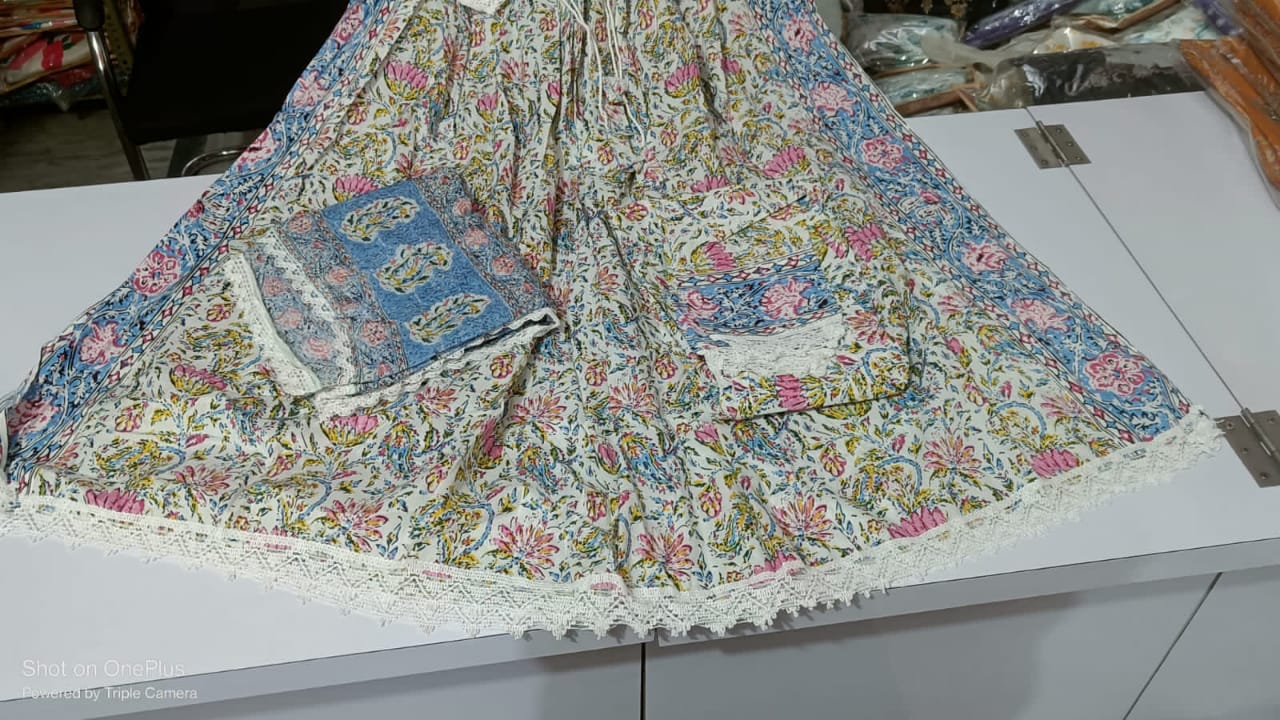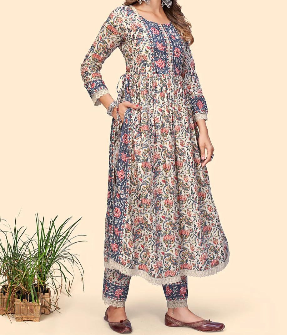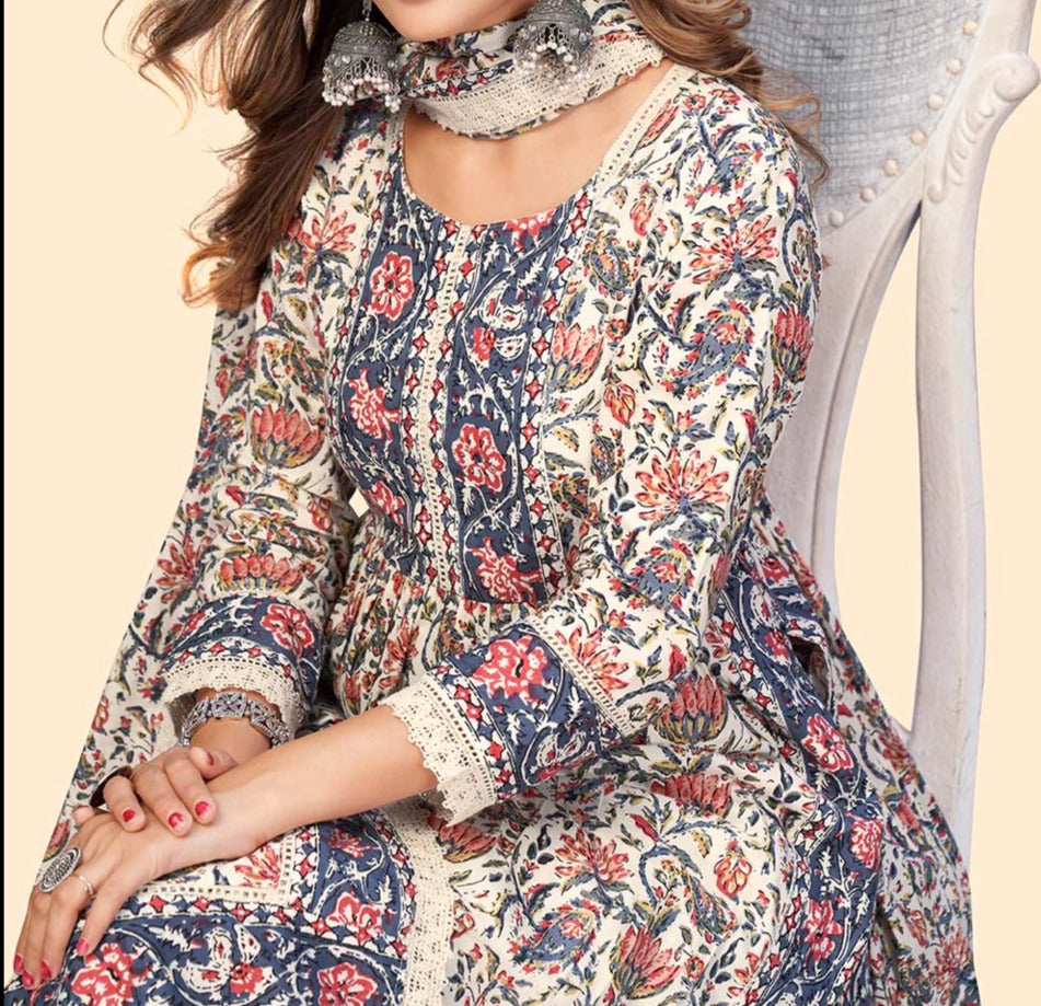 Upgrade your closet with this luxurious designer Jaipuri Kurti set. Made from the highest quality cotton fabric, this set features a timeless floral pattern and intricate Lace details that add a sophisticated and enchanting touch to any ensemble. Meticulously crafted with exquisite attention to detail, this kurti set will elevate your overall look.