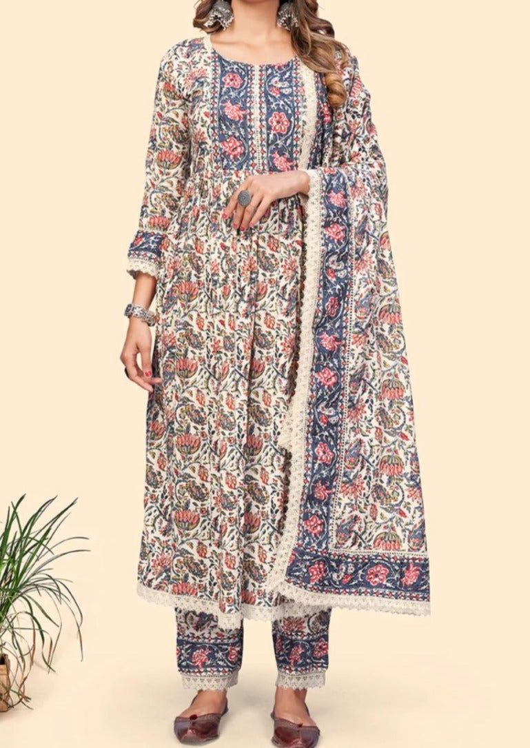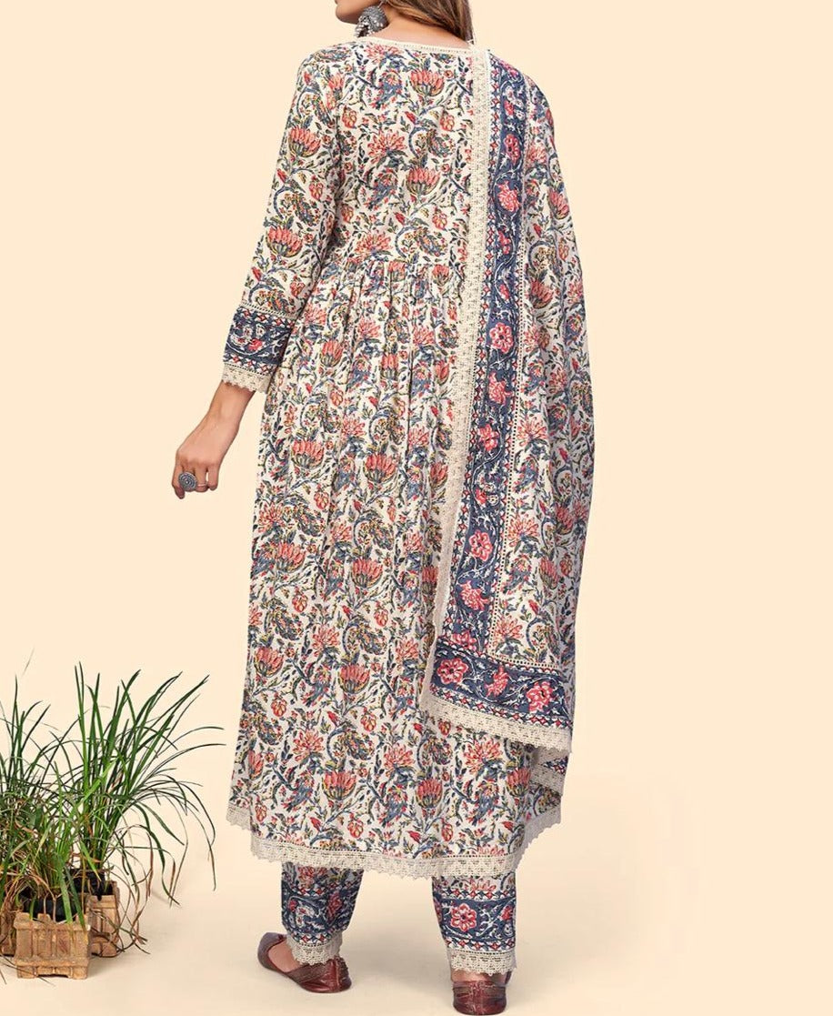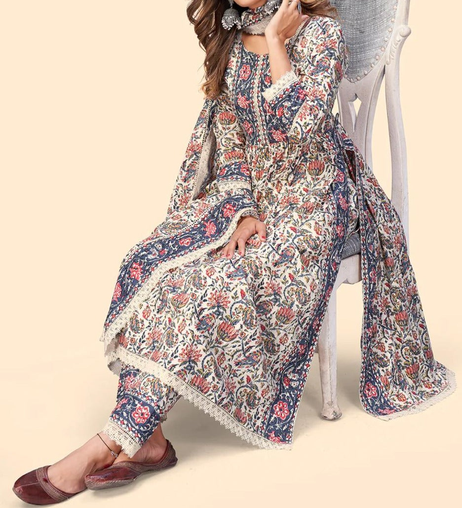 Upgrade your closet with this luxurious designer Jaipuri Kurti set. Made from the highest quality cotton fabric, this set features a timeless floral pattern and intricate Lace details that add a sophisticated and enchanting touch to any ensemble. Meticulously crafted with exquisite attention to detail, this kurti set will elevate your overall look.
