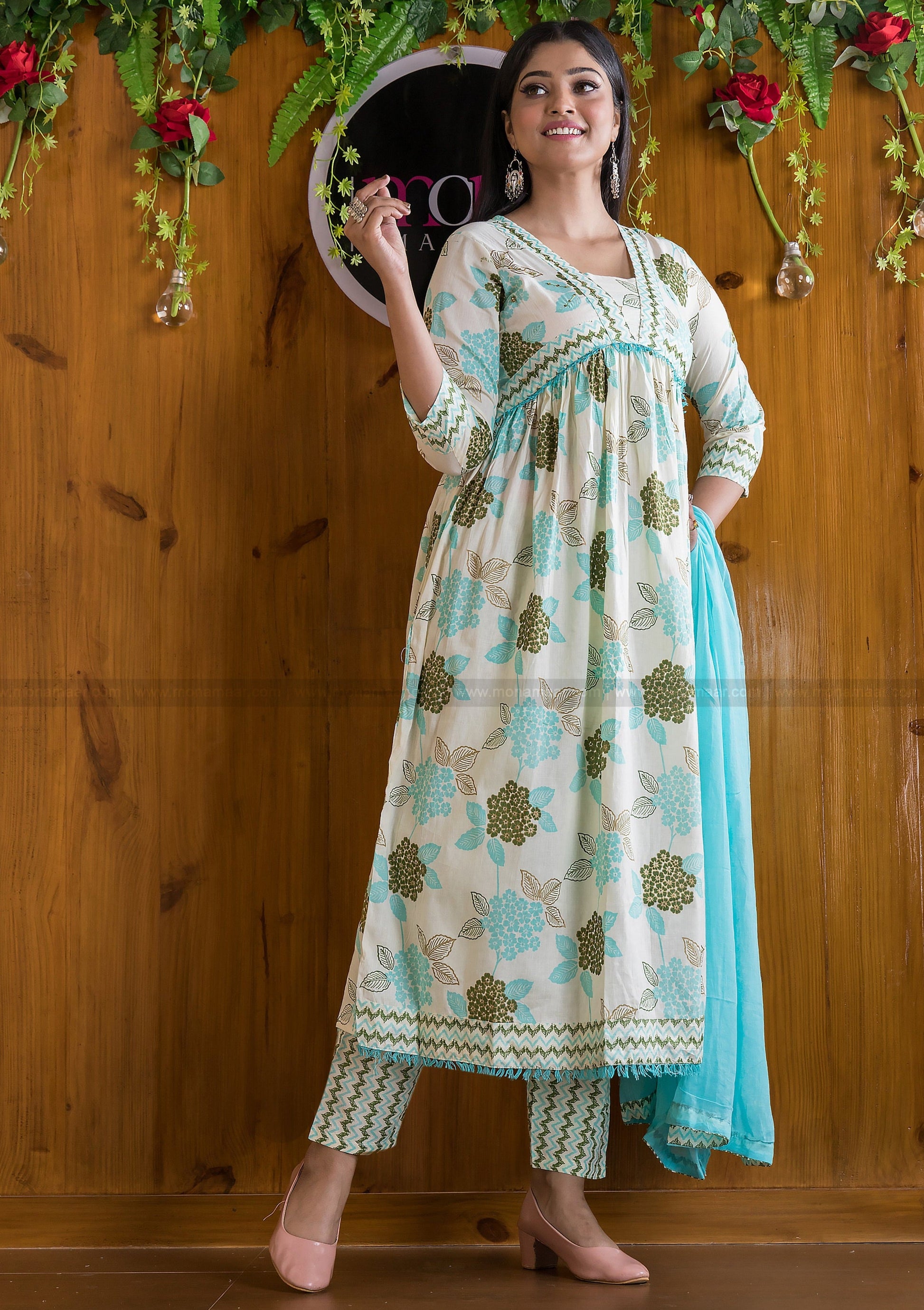 Floral Fantacy White Blue Anarkali Kurti Set