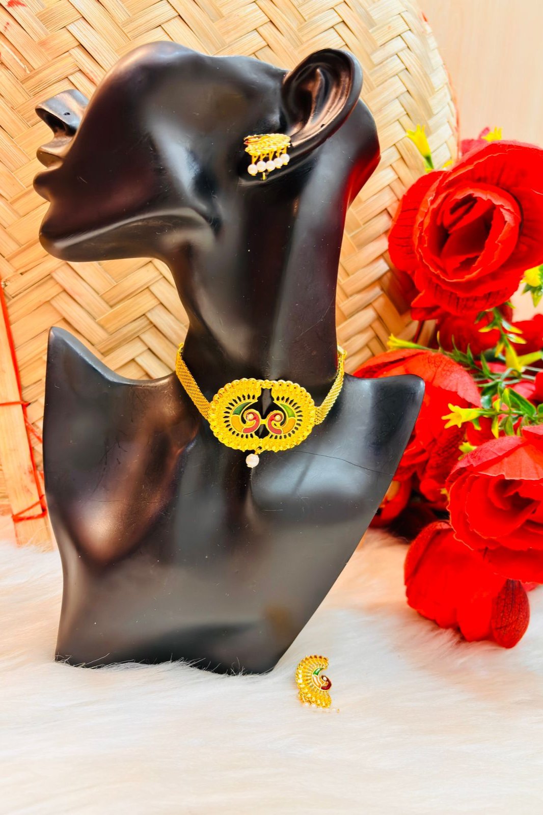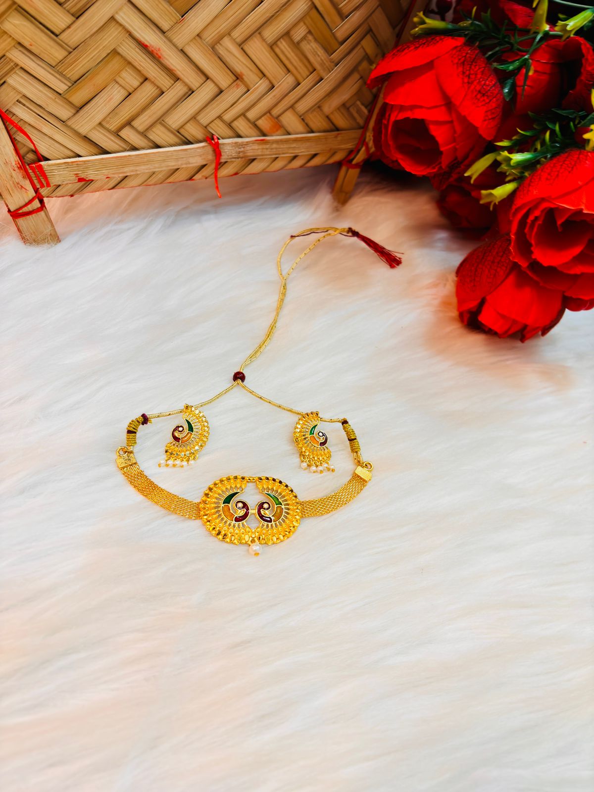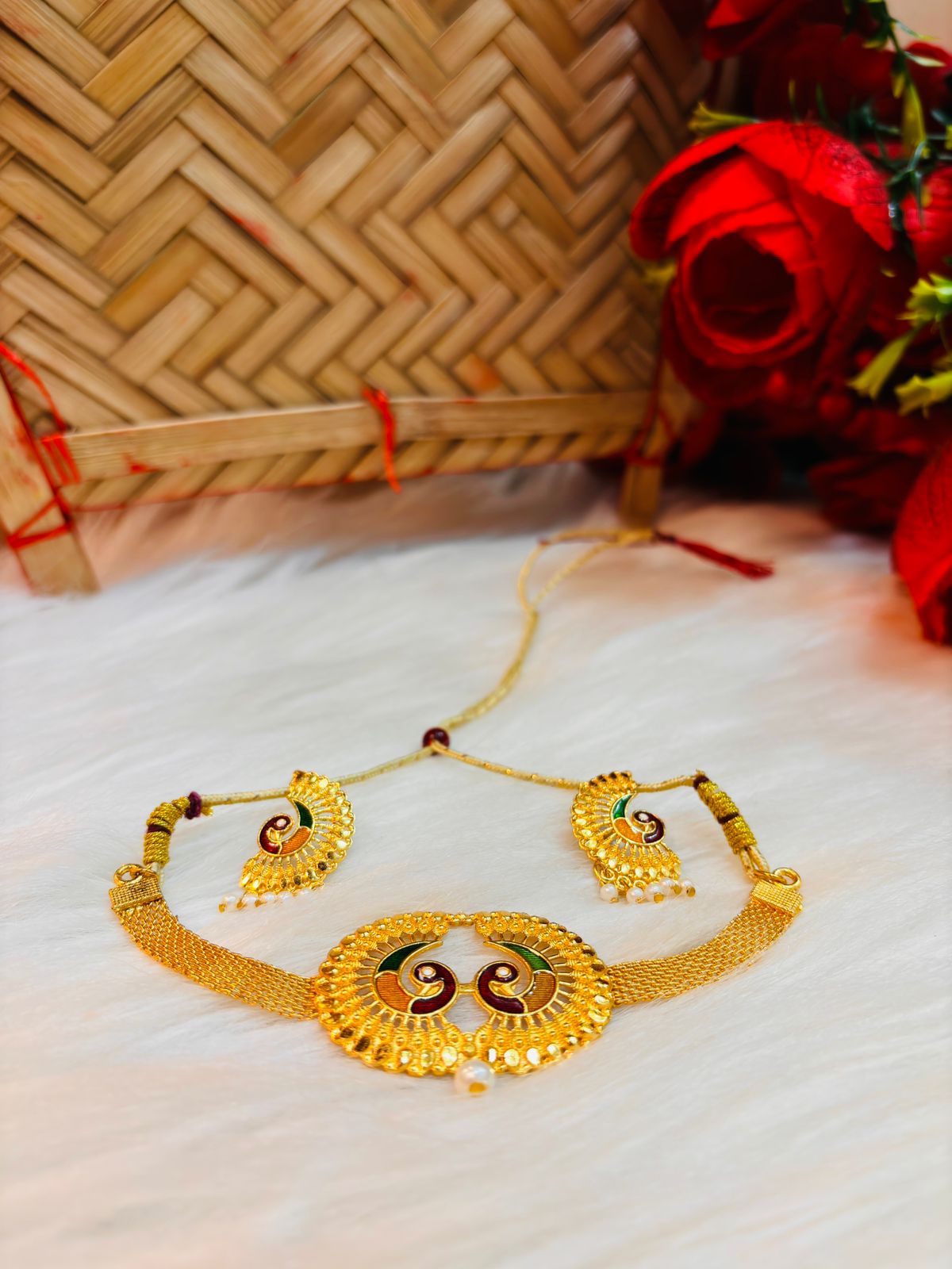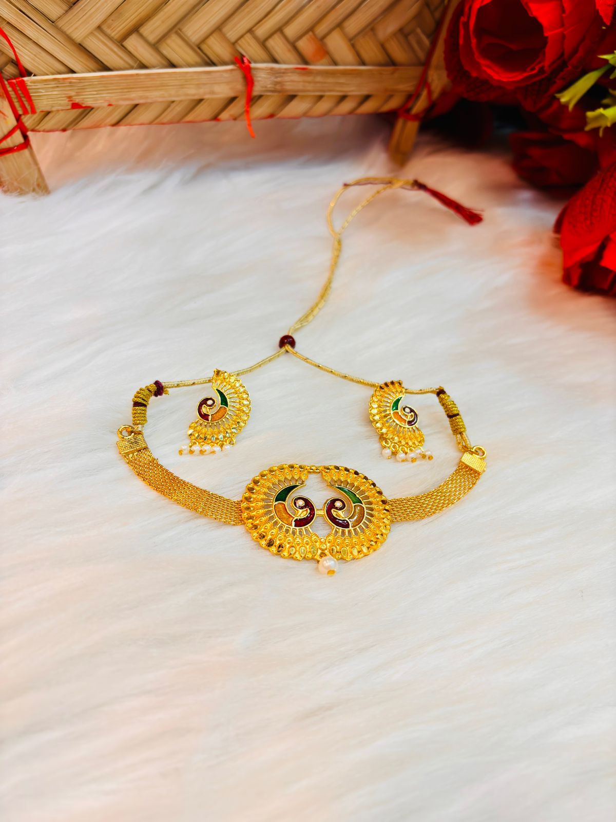 Enhance your outfit with a Gold-Plated Chocker and Ear ring set, perfect for adding a touch of shine. Versatile enough to pair with any outfit, this set is a must-have for any stylish wardrobe.
