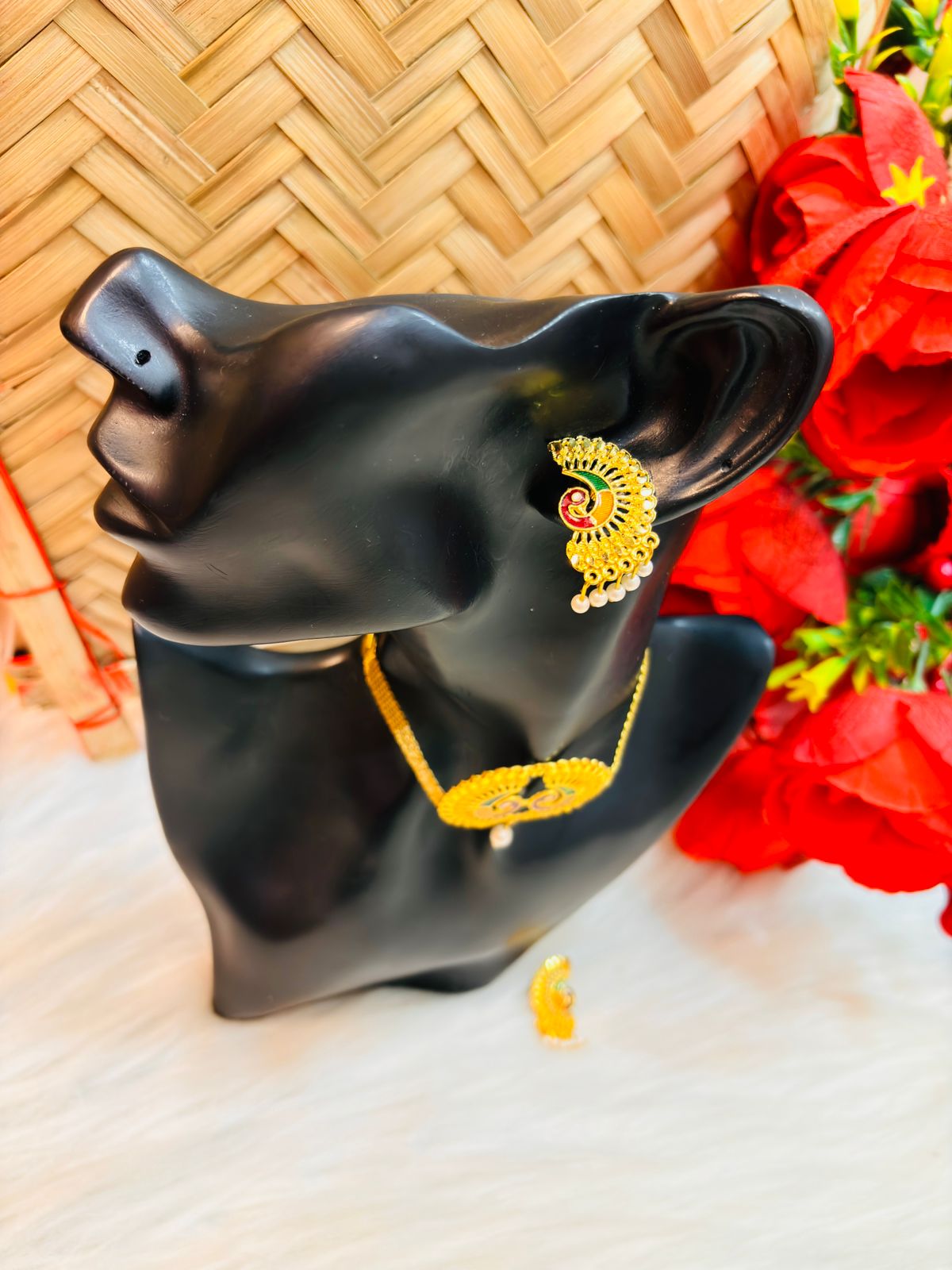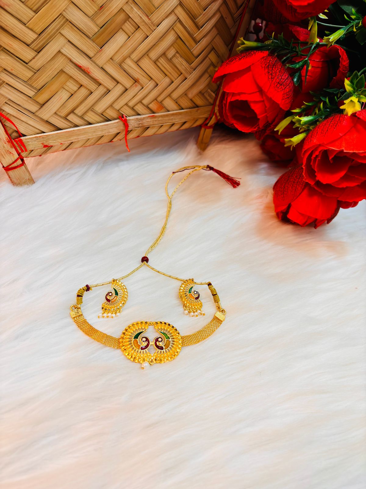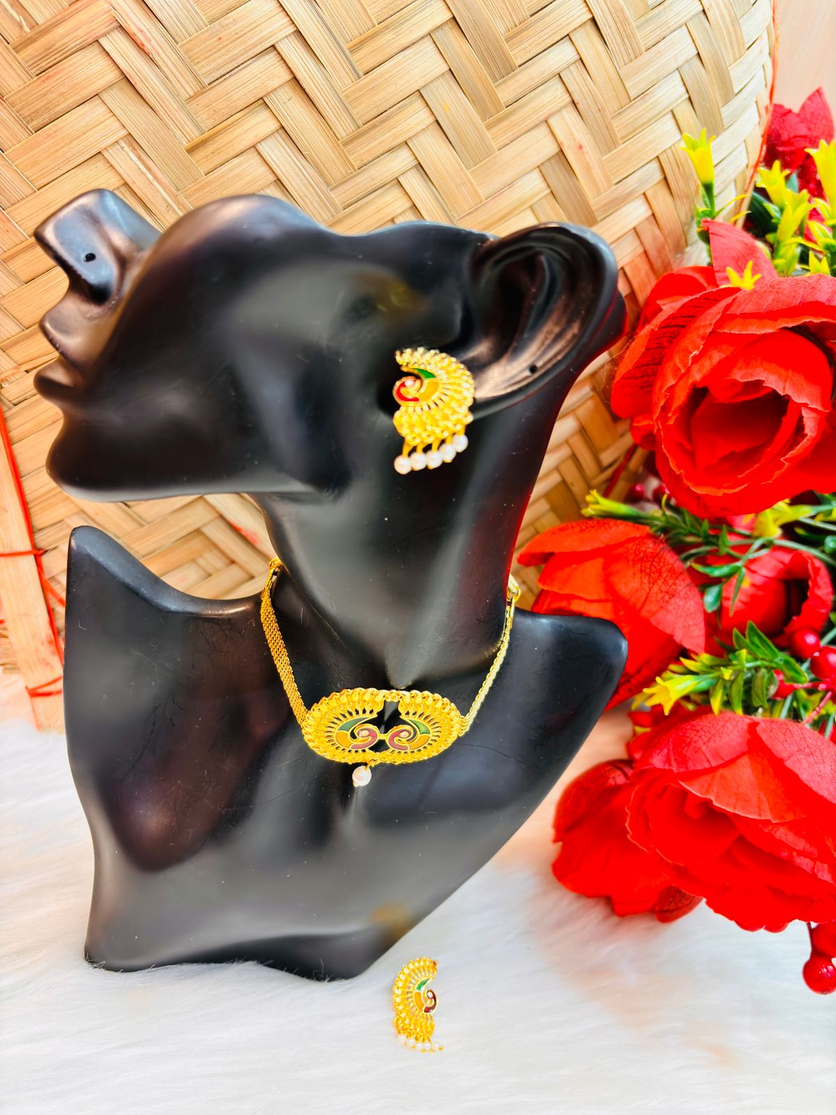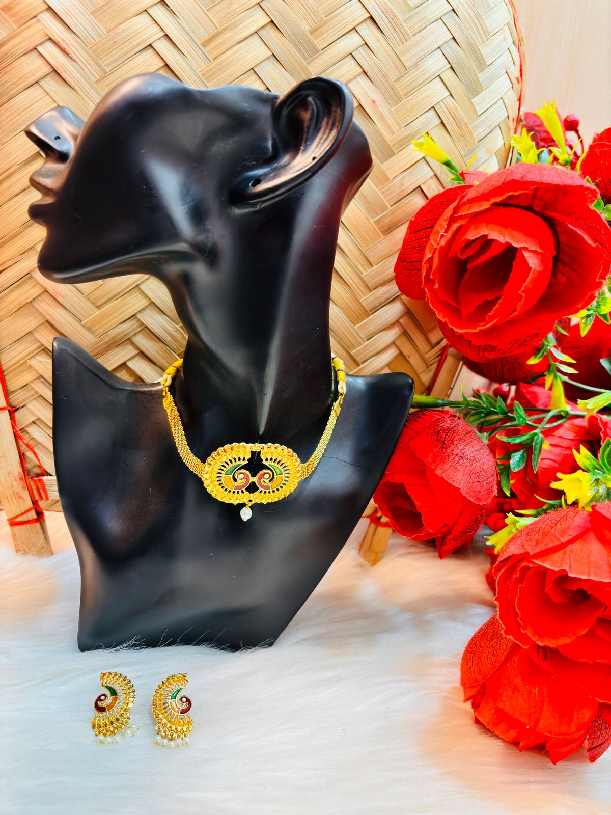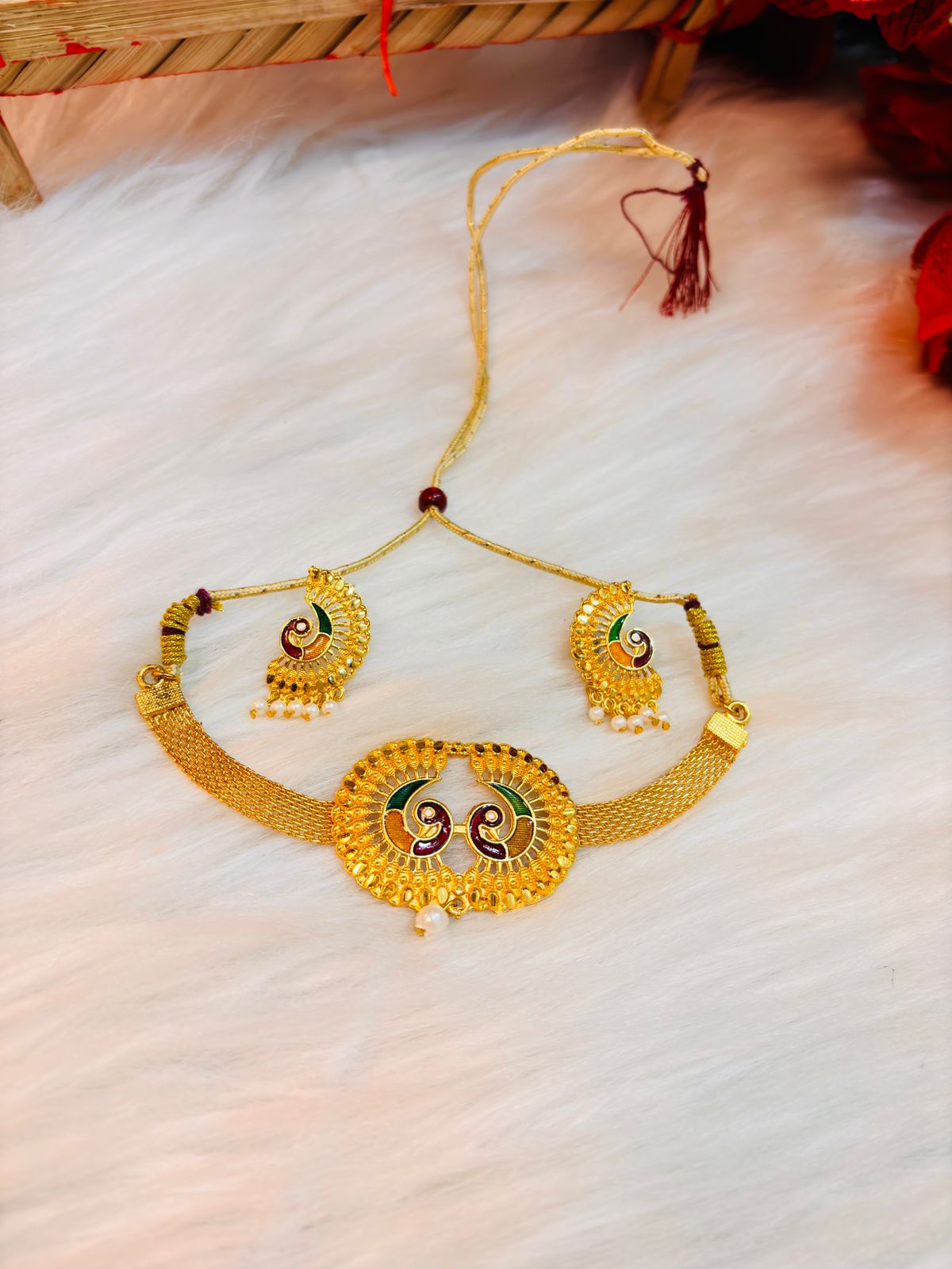 Enhance your outfit with a Gold-Plated Chocker and Ear ring set, perfect for adding a touch of shine. Versatile enough to pair with any outfit, this set is a must-have for any stylish wardrobe.