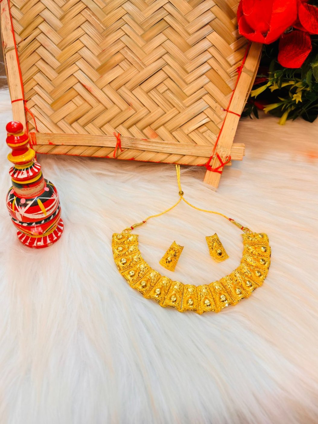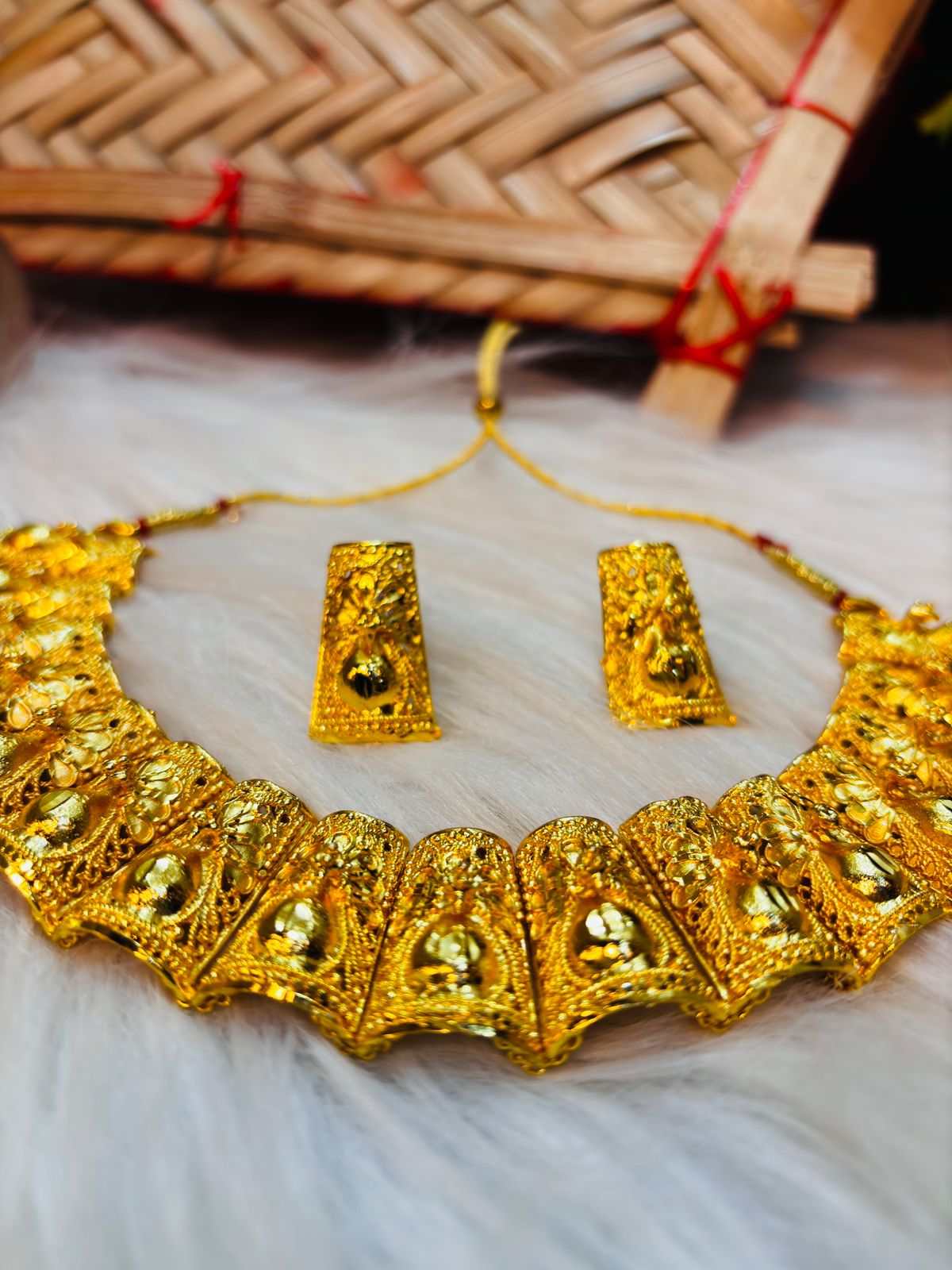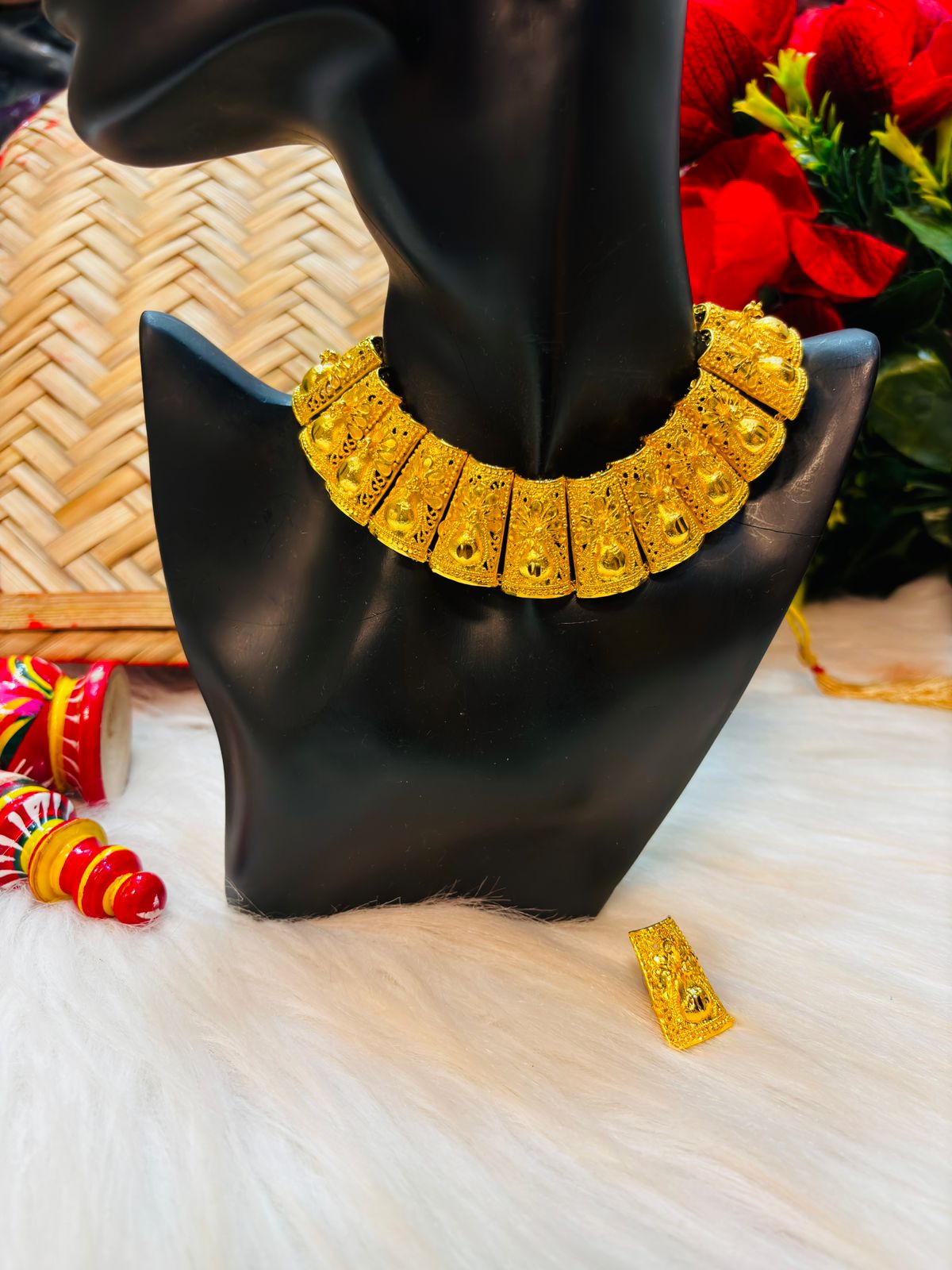 This Gold Plated Necklace Set is a necessary addition for weddings, as its intricate design beautifully complements the bride's makeup and enhances her overall look. This expertly crafted set exudes a rich and luxurious appearance, with a stunning matte finish. Whether it's for a wedding day or any other special occasion, the gold adds an element of sophistication and tradition to any outfit. This must-have accessory is perfect for all occasions.