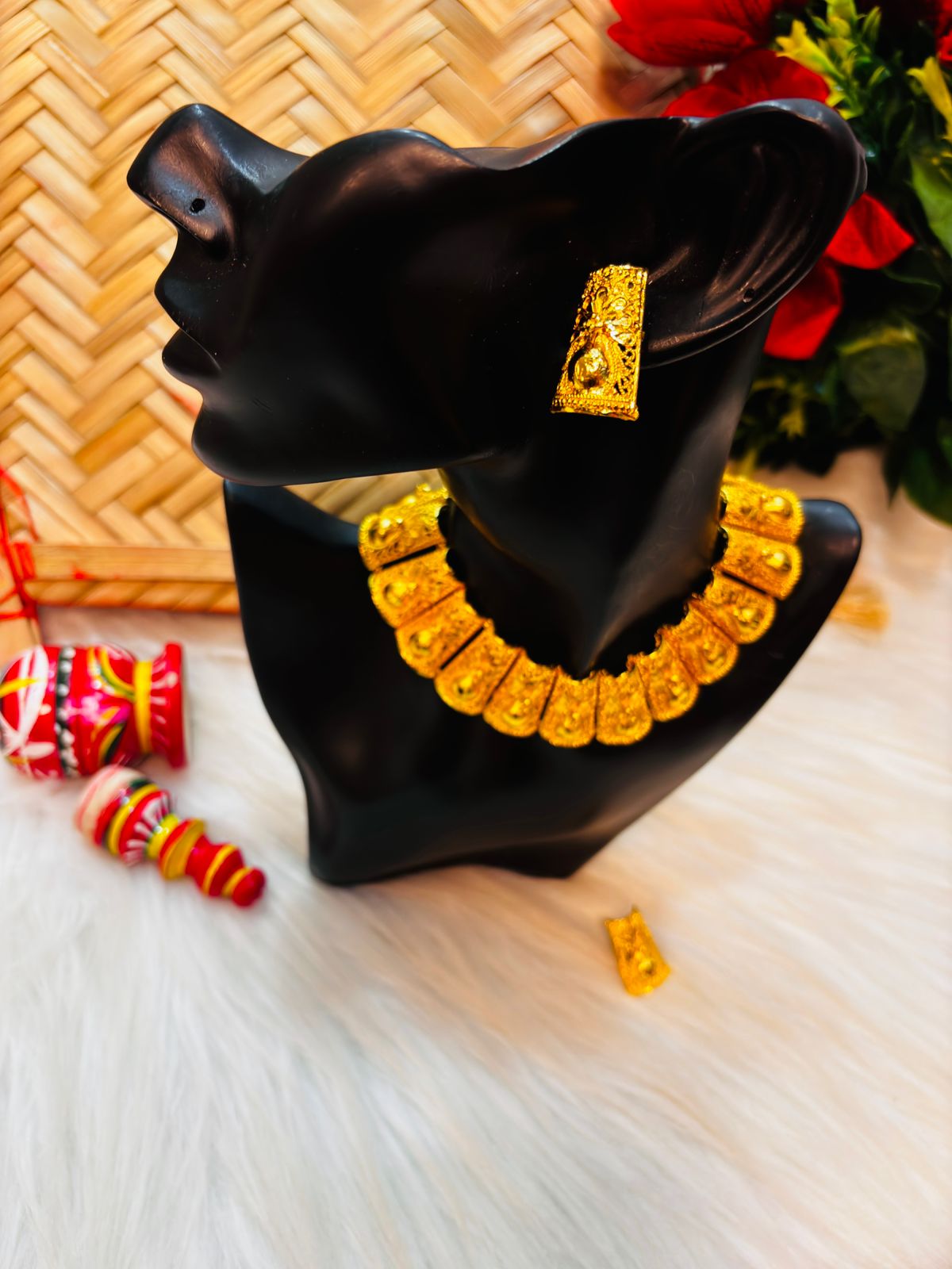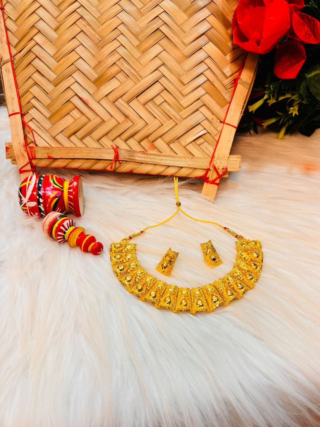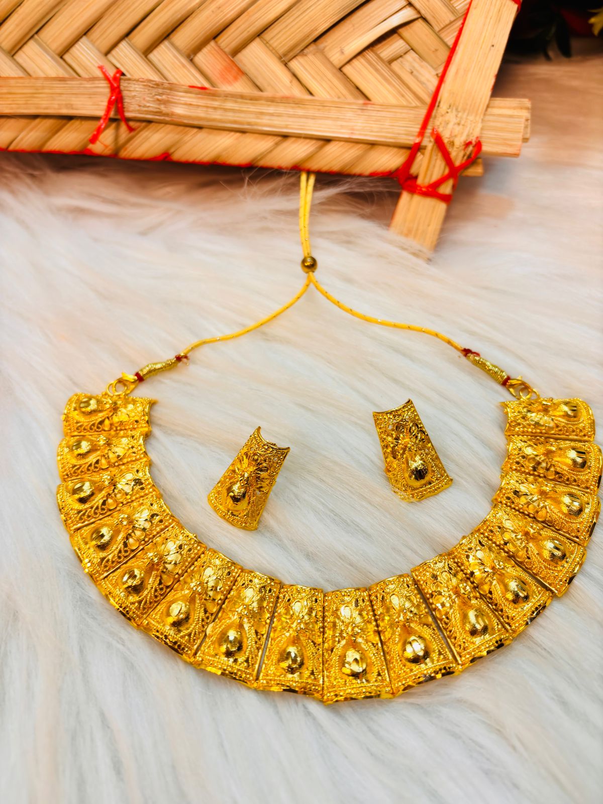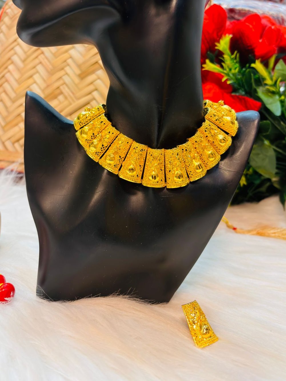 This Gold Plated Necklace Set is a necessary addition for weddings, as its intricate design beautifully complements the bride's makeup and enhances her overall look. This expertly crafted set exudes a rich and luxurious appearance, with a stunning matte finish. Whether it's for a wedding day or any other special occasion, the gold adds an element of sophistication and tradition to any outfit. This must-have accessory is perfect for all occasions.