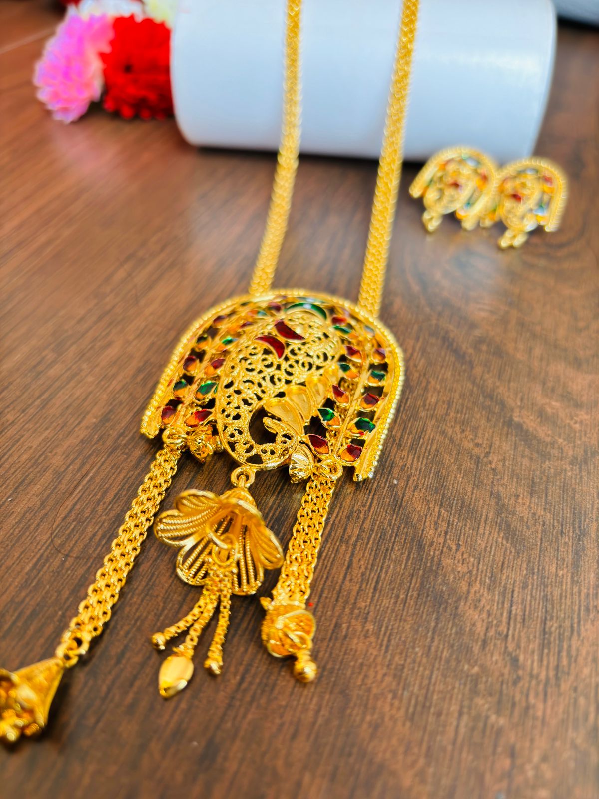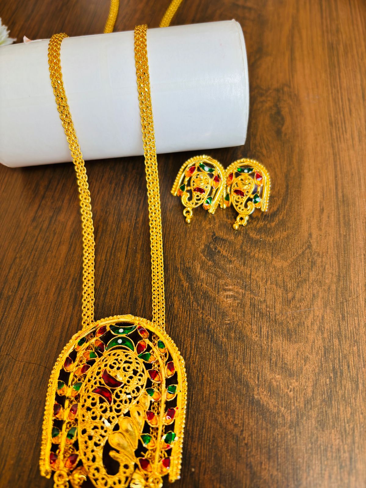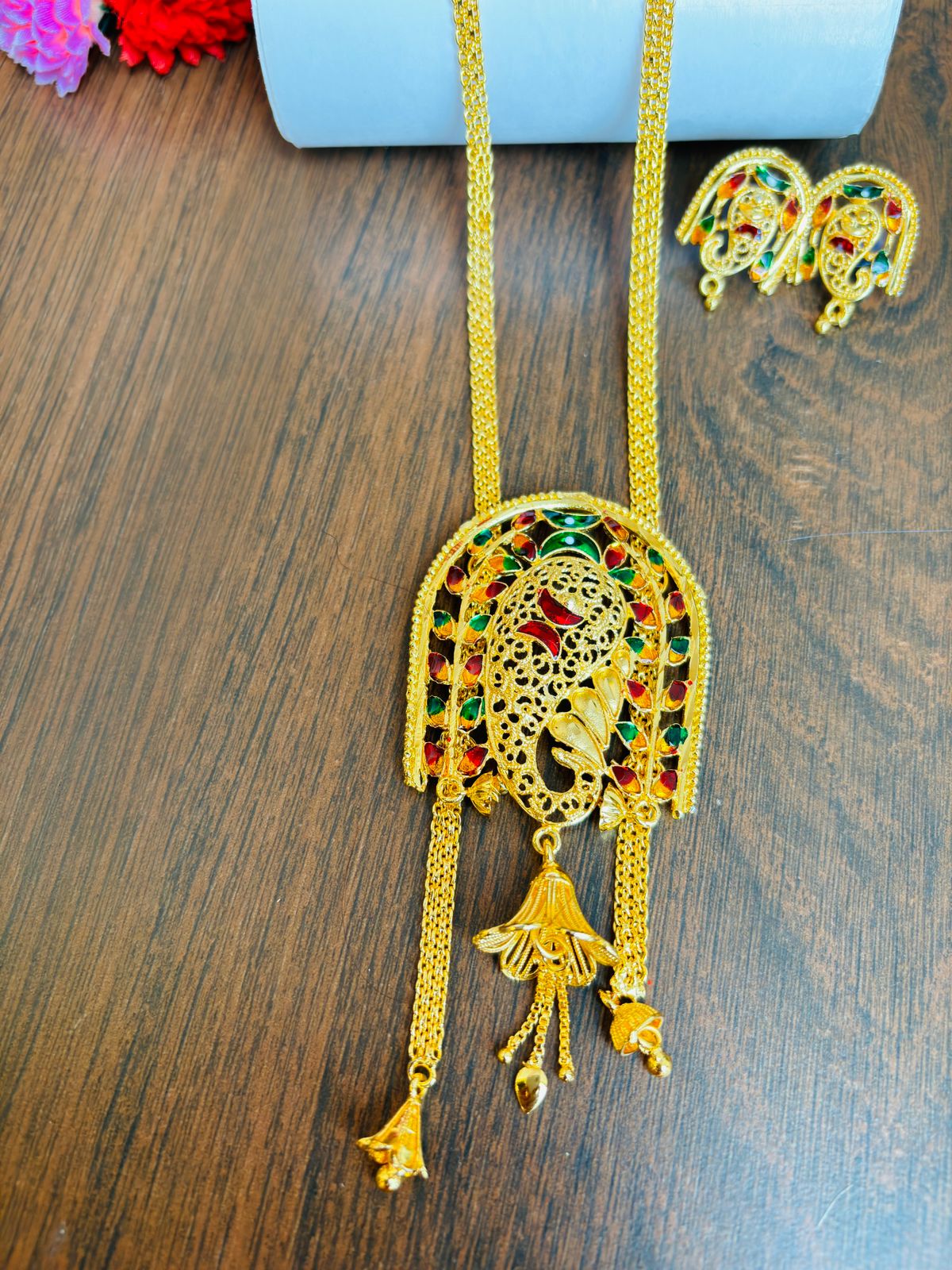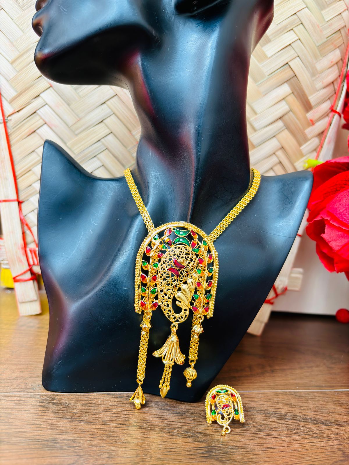 This elegant Gold Plated Necklace Set features a long chain and a stunning pendant with intricate paisley work. The gold plating adds a touch of luxury and the paisley design adds a unique and timeless element. Perfect for adding a touch of sophistication to any outfit.