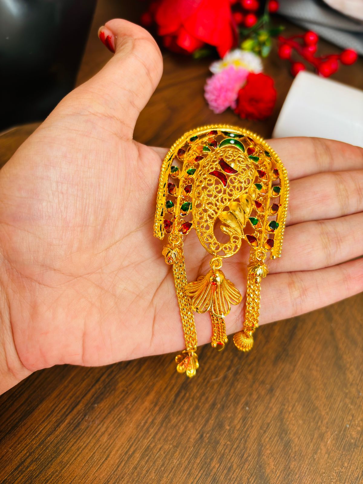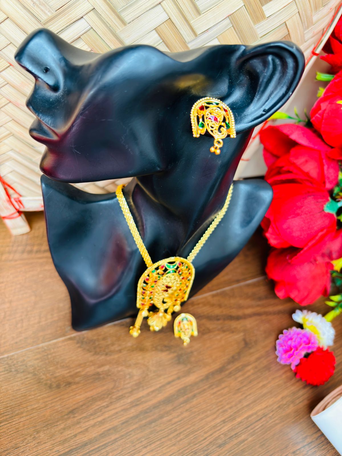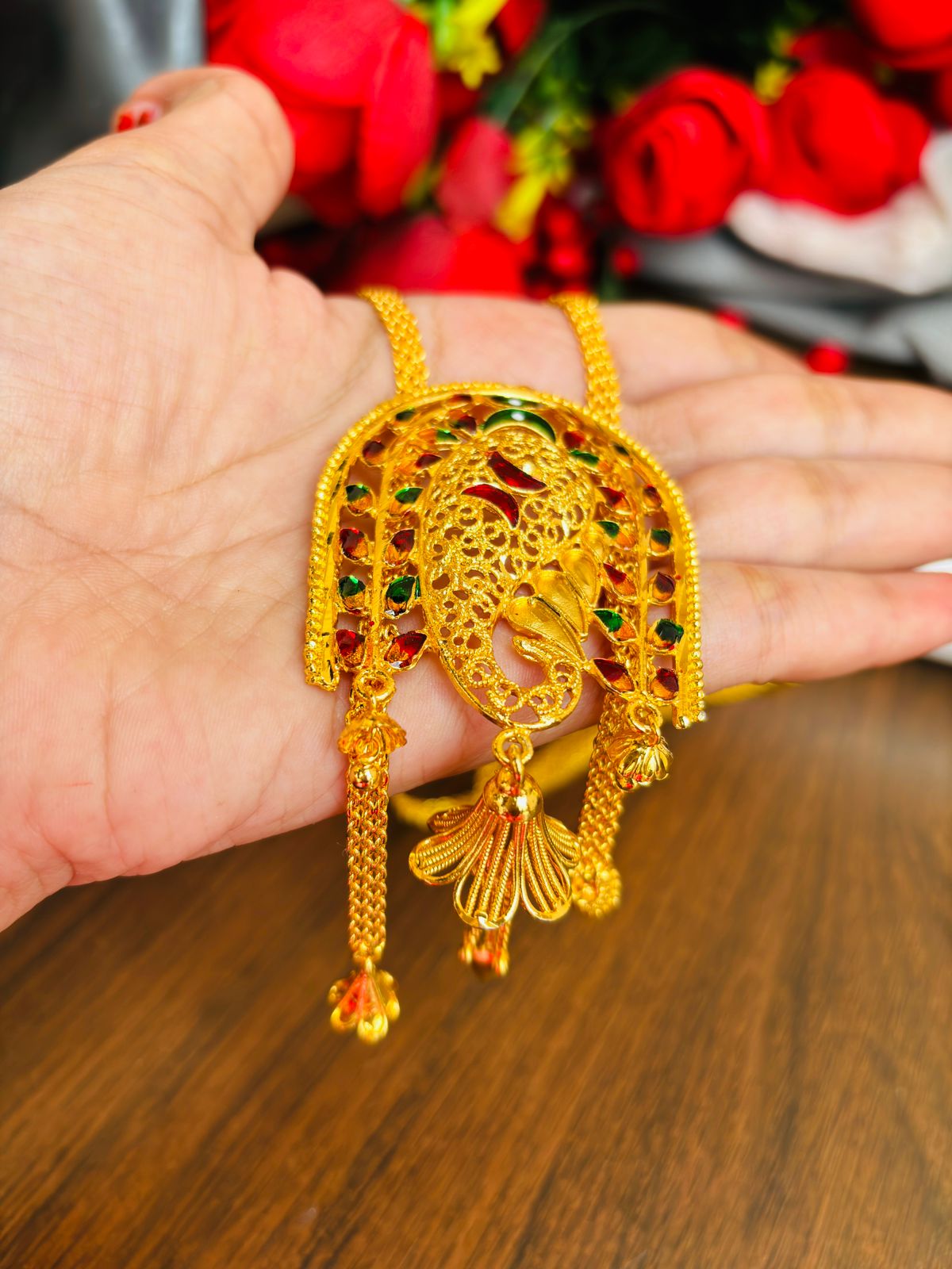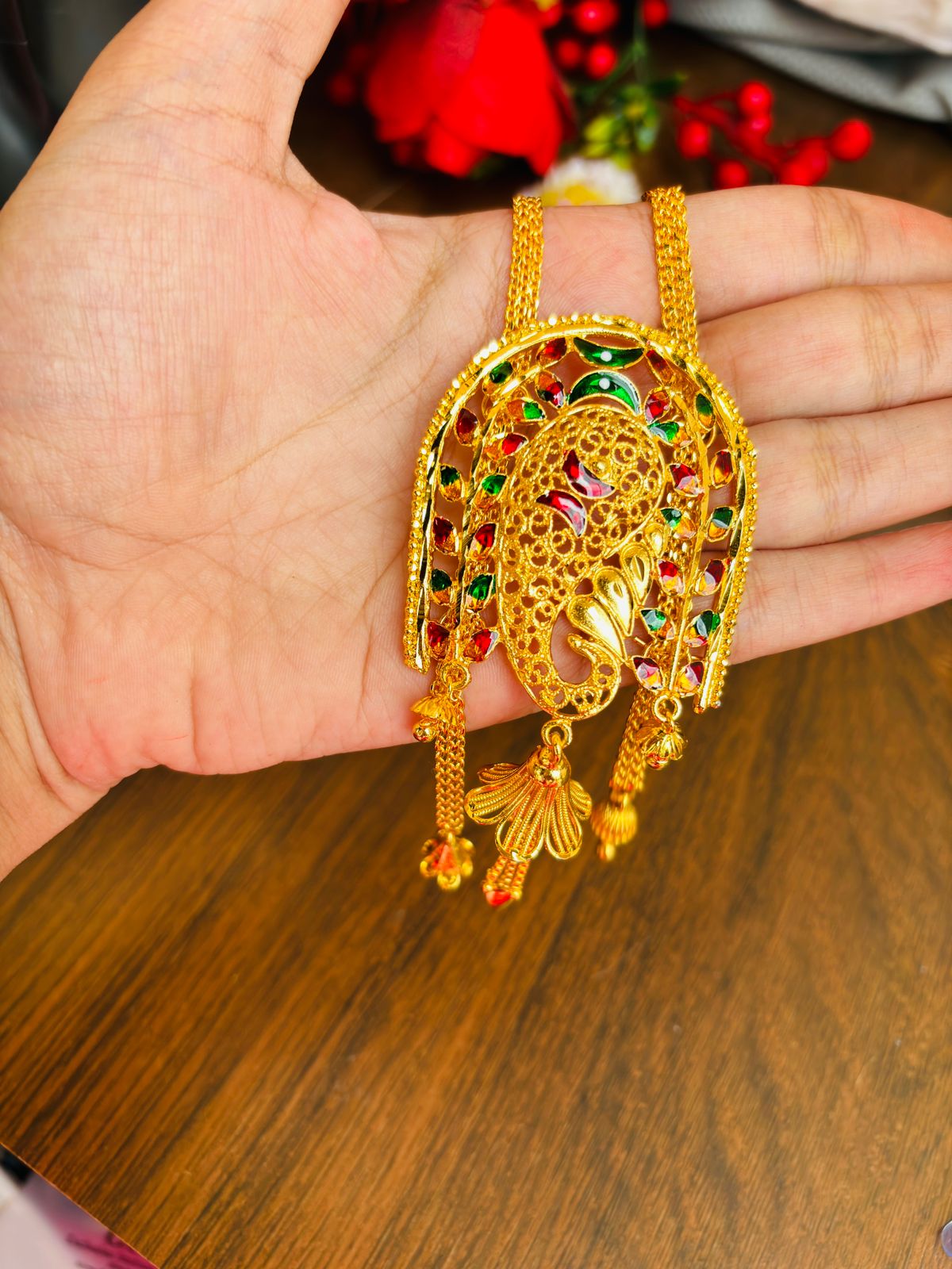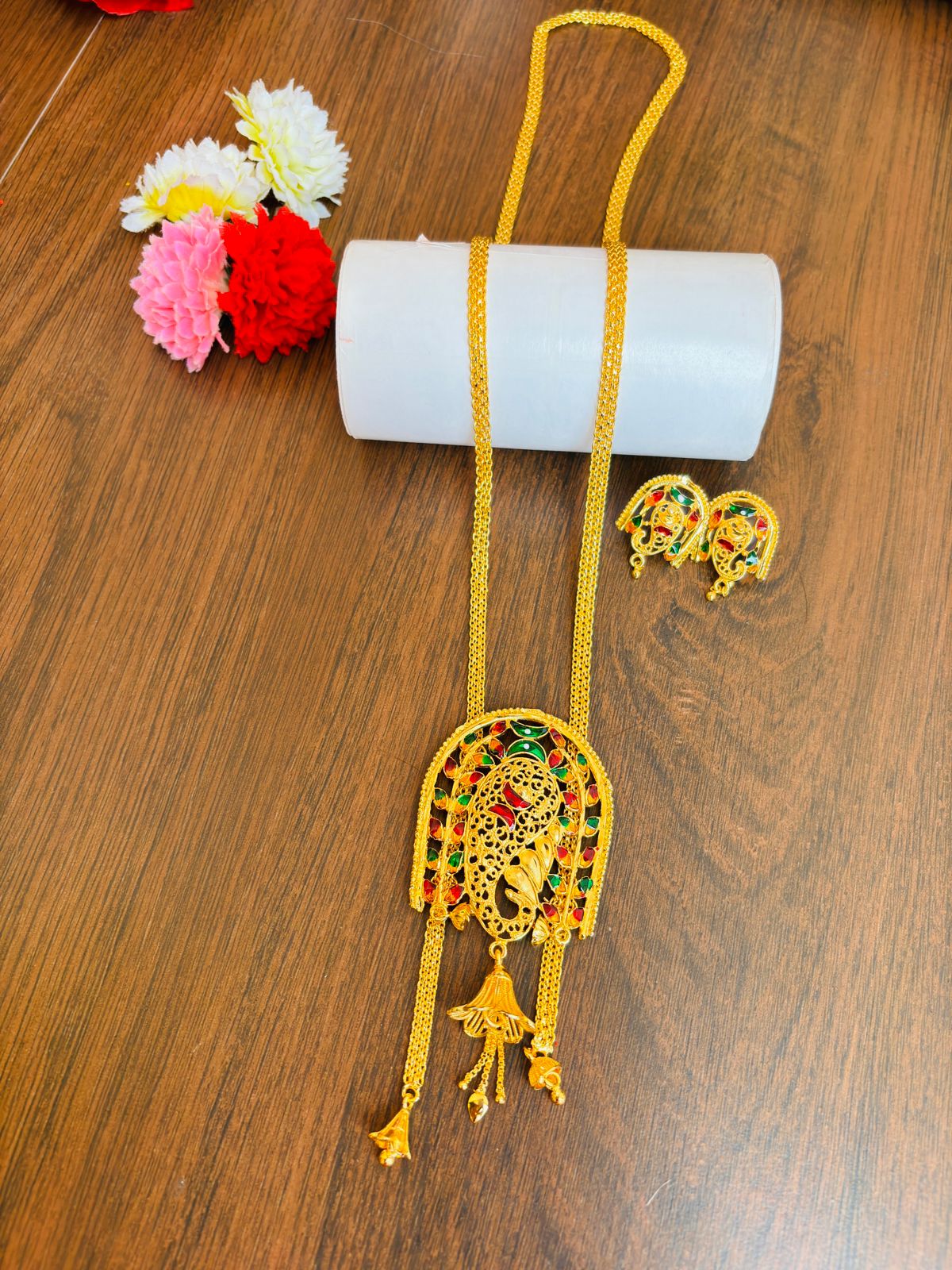 This elegant Gold Plated Necklace Set features a long chain and a stunning pendant with intricate paisley work. The gold plating adds a touch of luxury and the paisley design adds a unique and timeless element. Perfect for adding a touch of sophistication to any outfit.