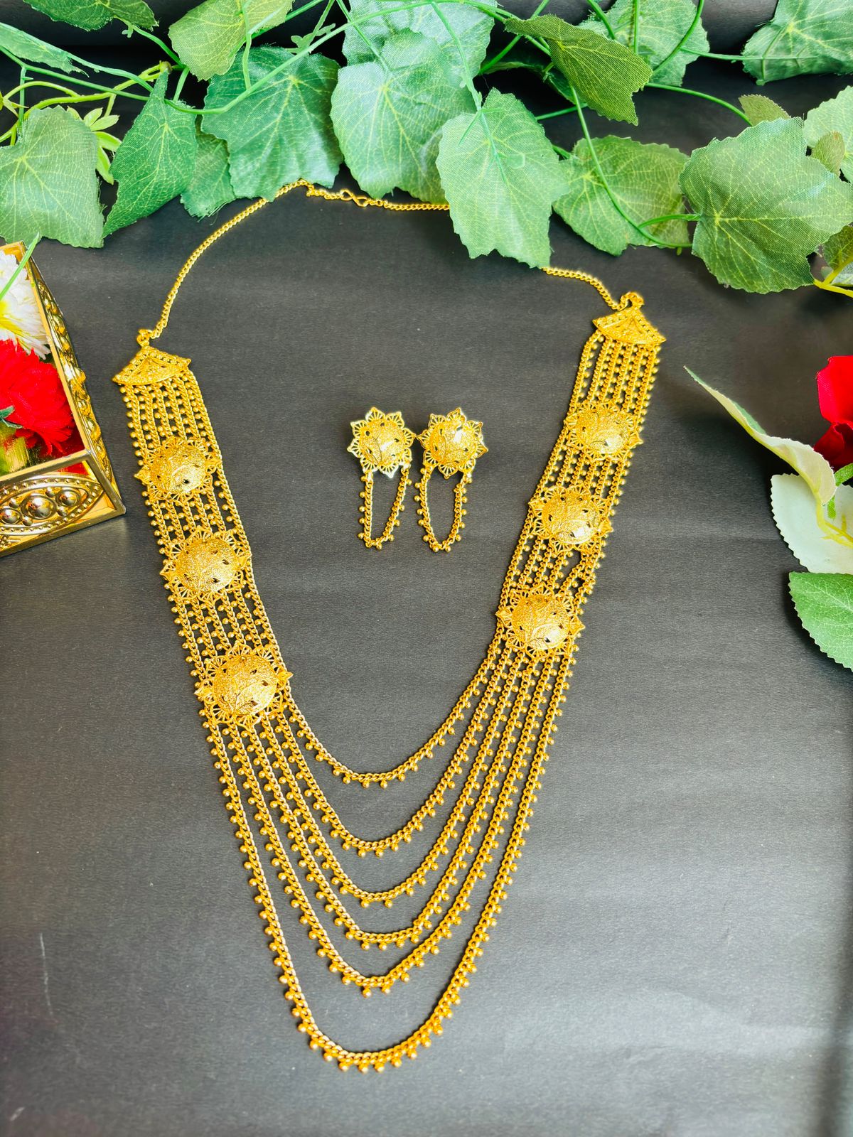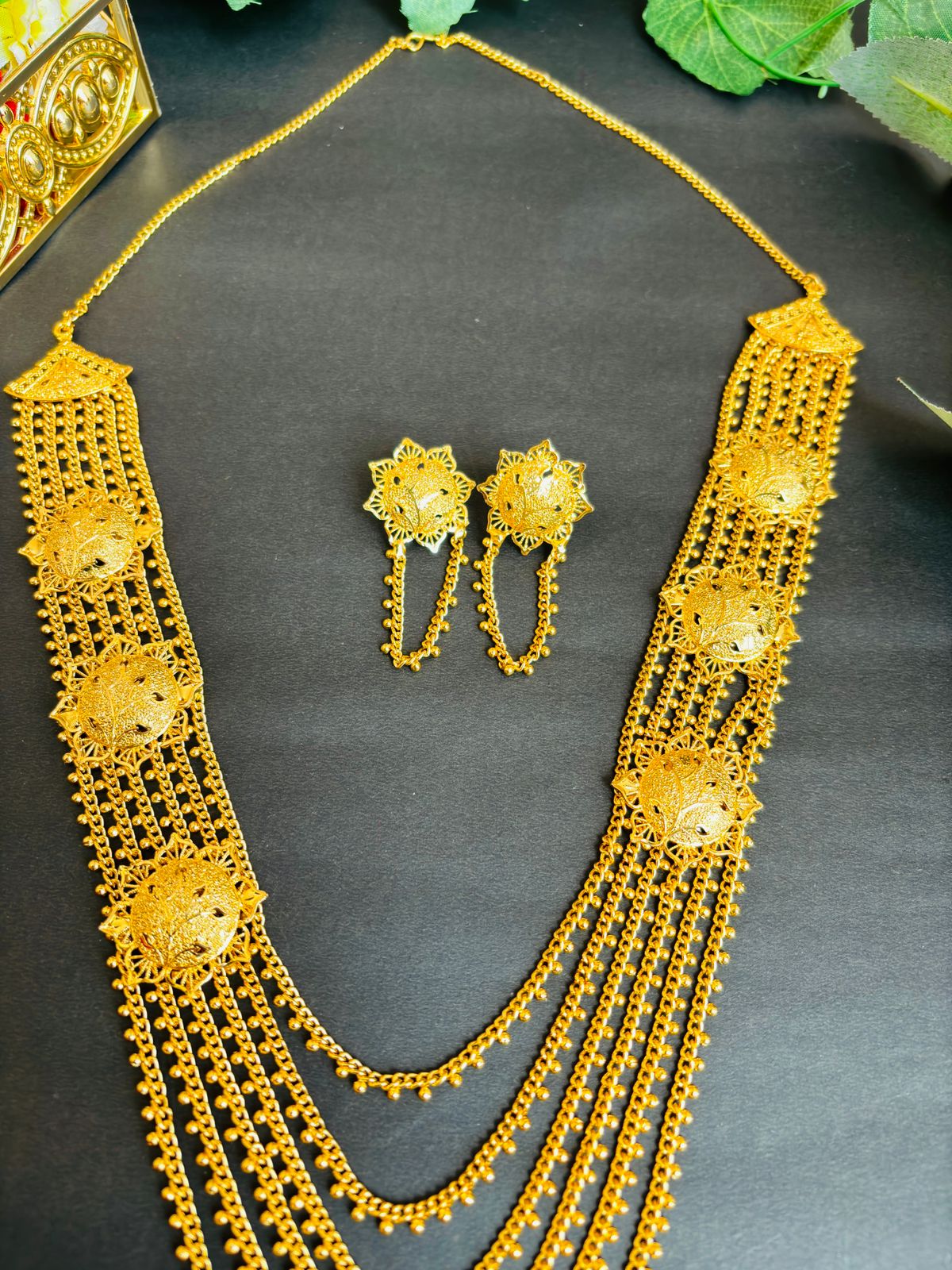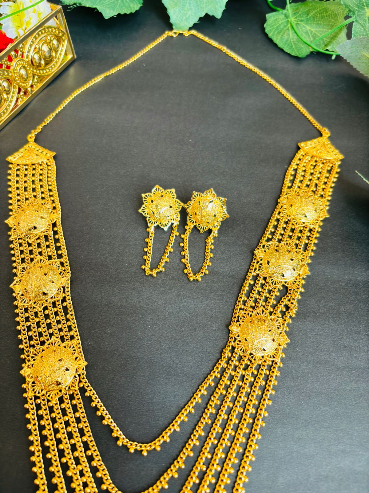 Unleash your style potential with the Gold Plated Collection, featuring a chic glossy finish and a one-of-a-kind design. This set includes a designer 1p necklace, 2-piece earnings, all plated with luxurious golden color . Elevate your fashion game now!