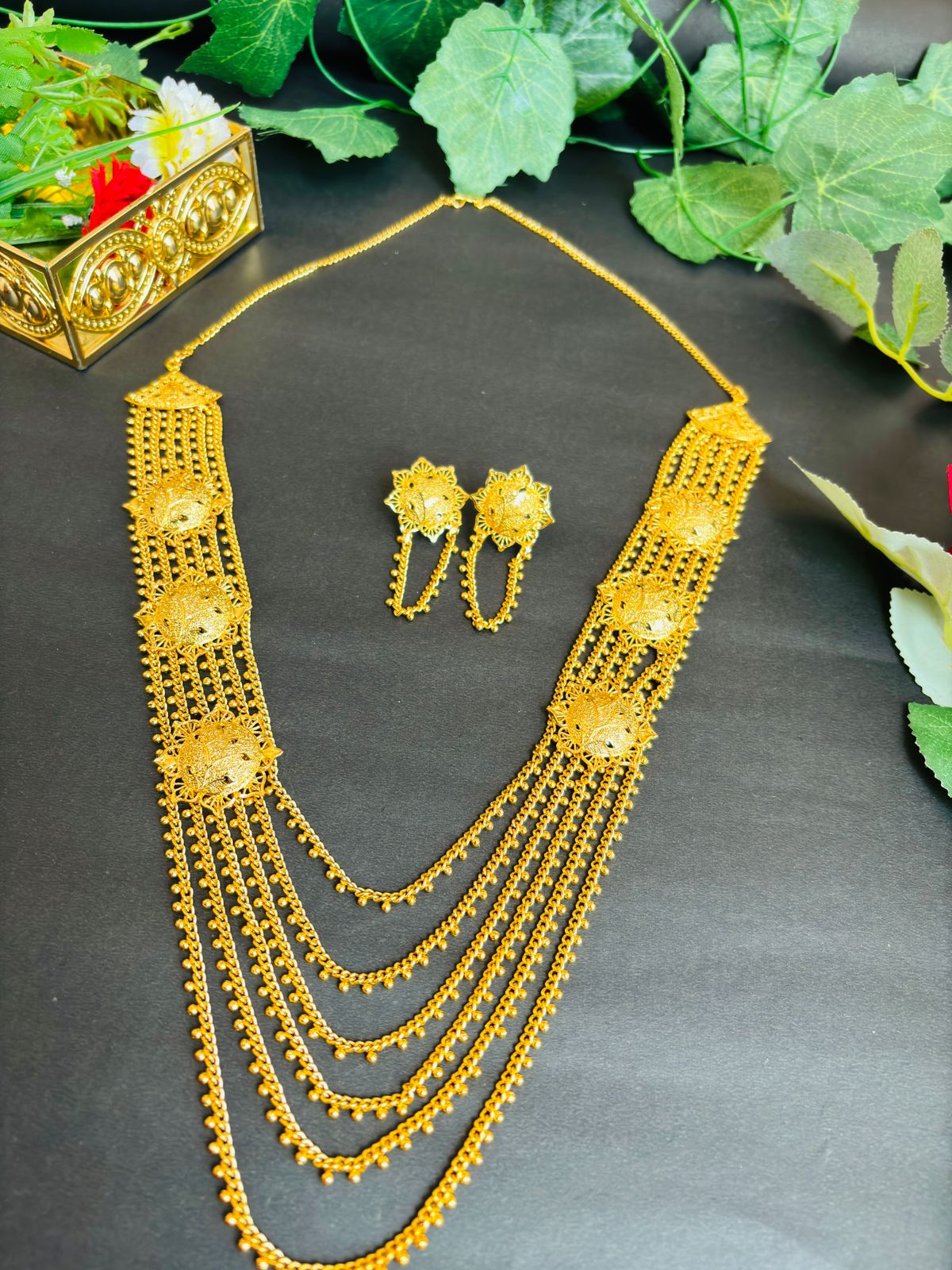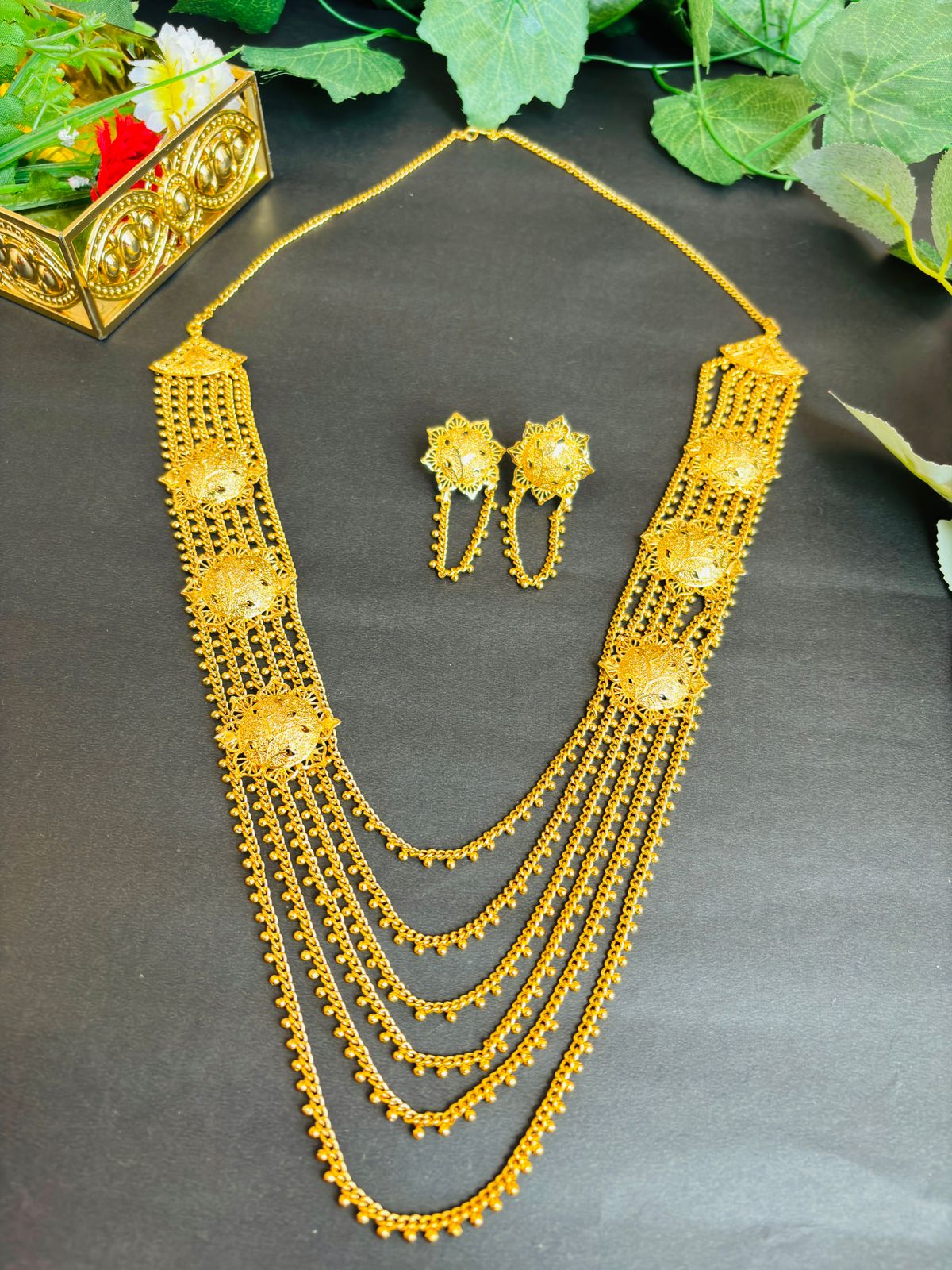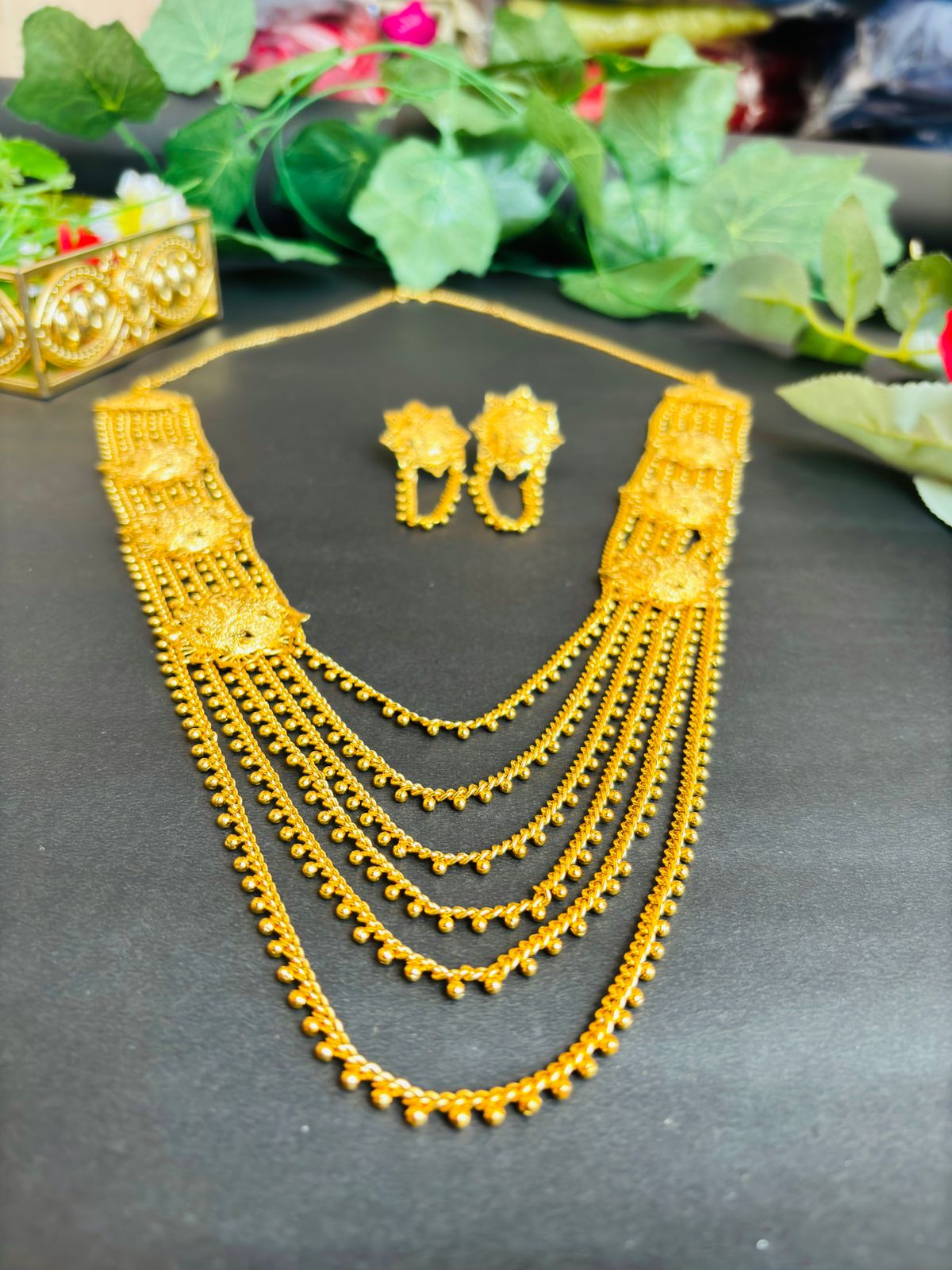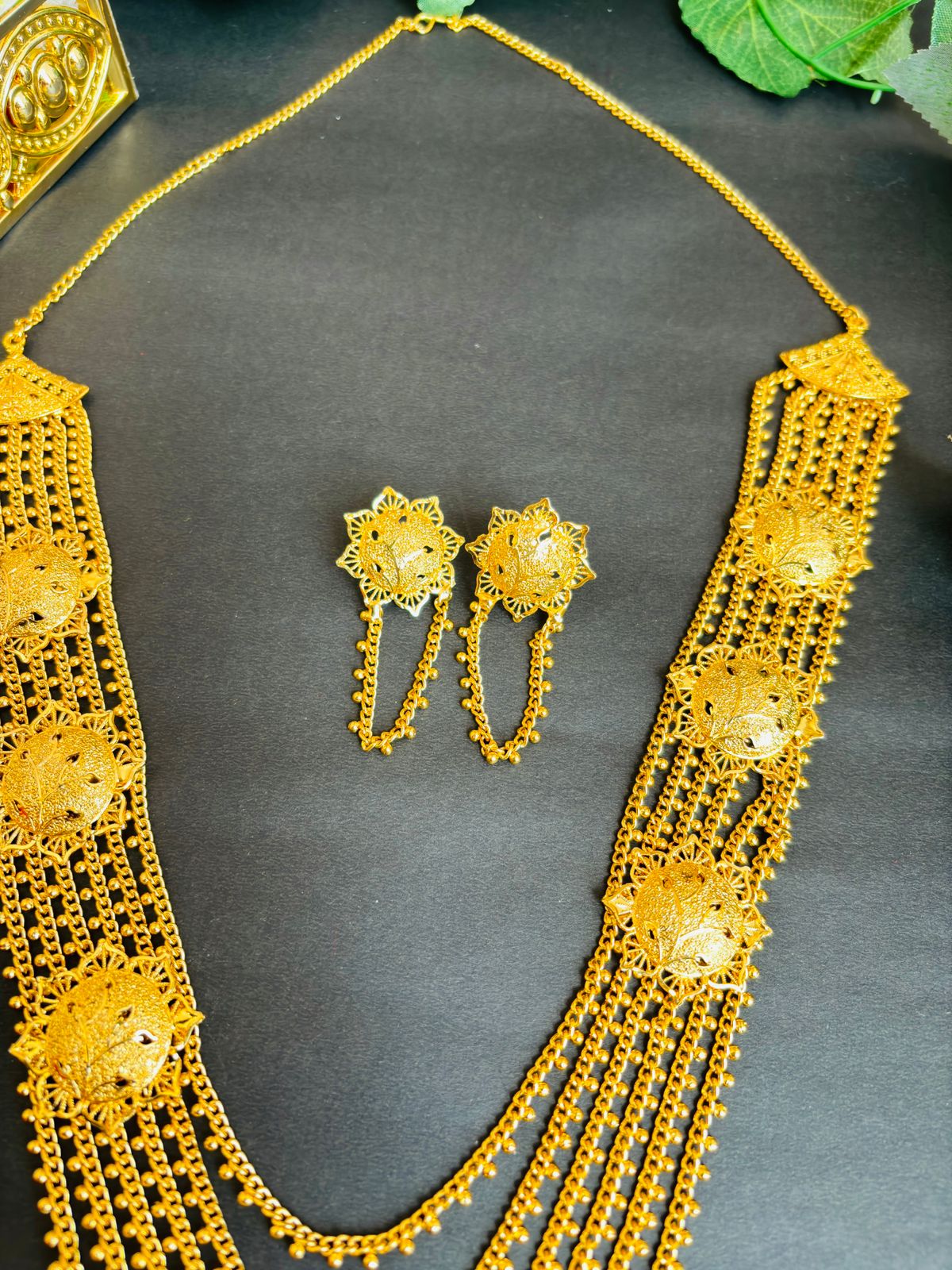 Unleash your style potential with the Gold Plated Collection, featuring a chic glossy finish and a one-of-a-kind design. This set includes a designer 1p necklace, 2-piece earnings, all plated with luxurious golden color . Elevate your fashion game now!