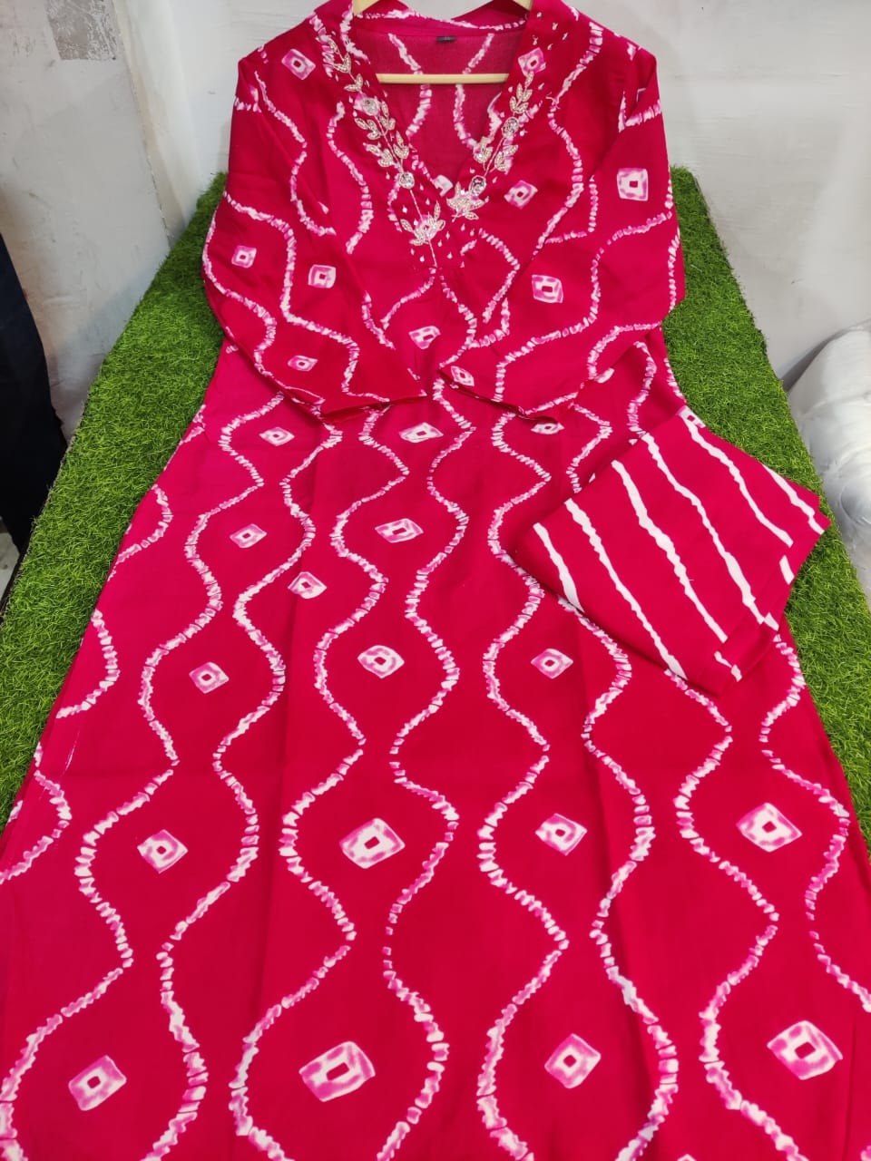 Explore a romantic romance with this magical Kurti Set for the upcoming celebrations: made from Soft Rayon, embellished with a lovely Bandhej print and detailed sequin work on the neckline, and showcasing a fresh design, it's the perfect choice for this festive season. Flaunt your fashion sense with this unique kurta set.