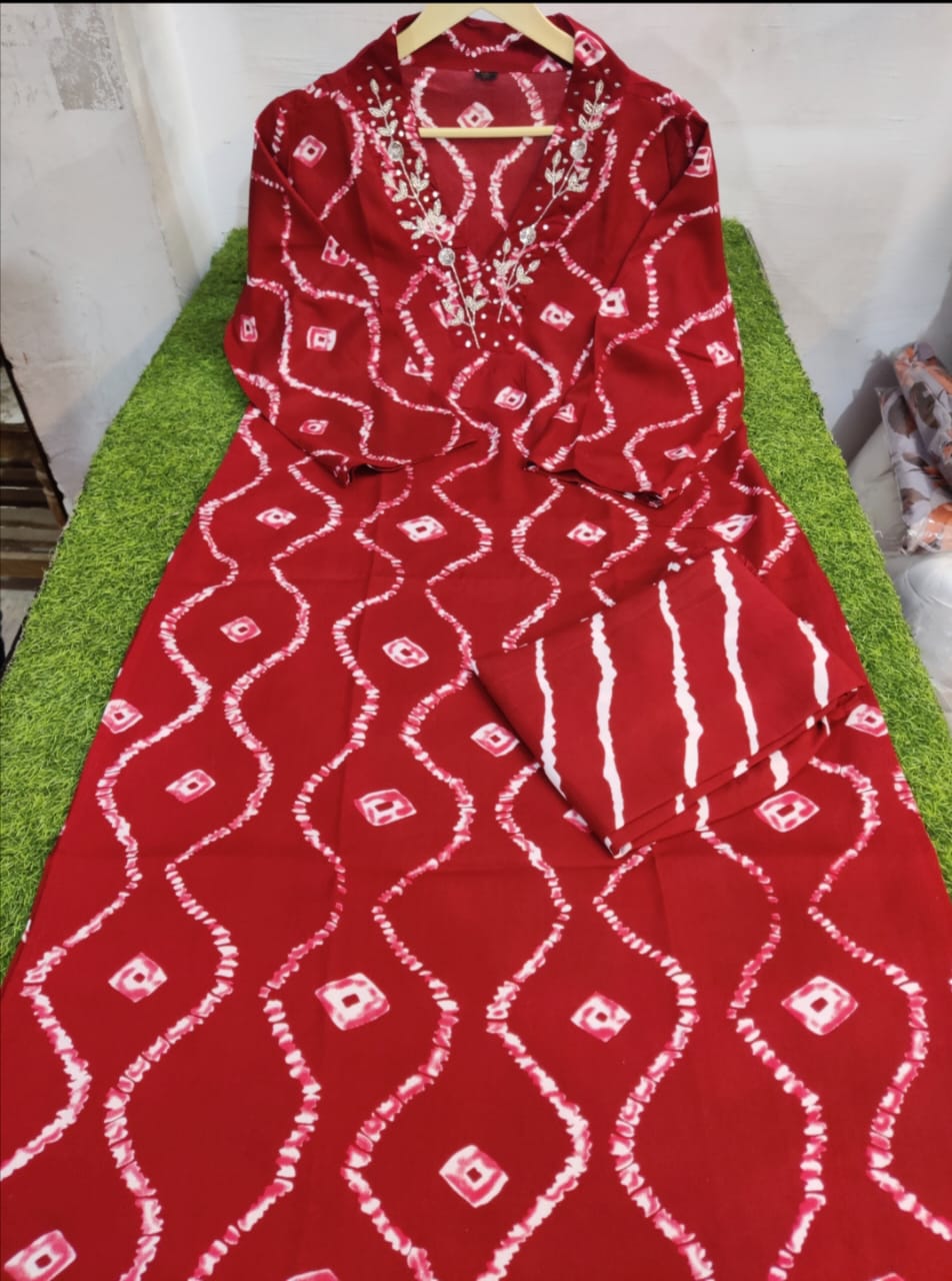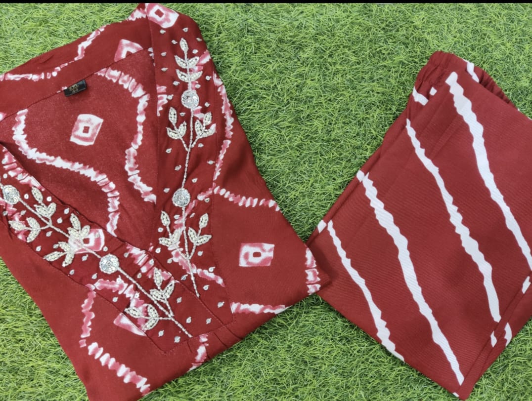Explore a romantic romance with this magical Kurti Set for the upcoming celebrations: made from Rayon, embellished with a lovely Bandhej print and detailed sequin work on the neckline, and showcasing a fresh design, it's the perfect choice for this festive season. Flaunt your fashion sense with this unique kurta set.