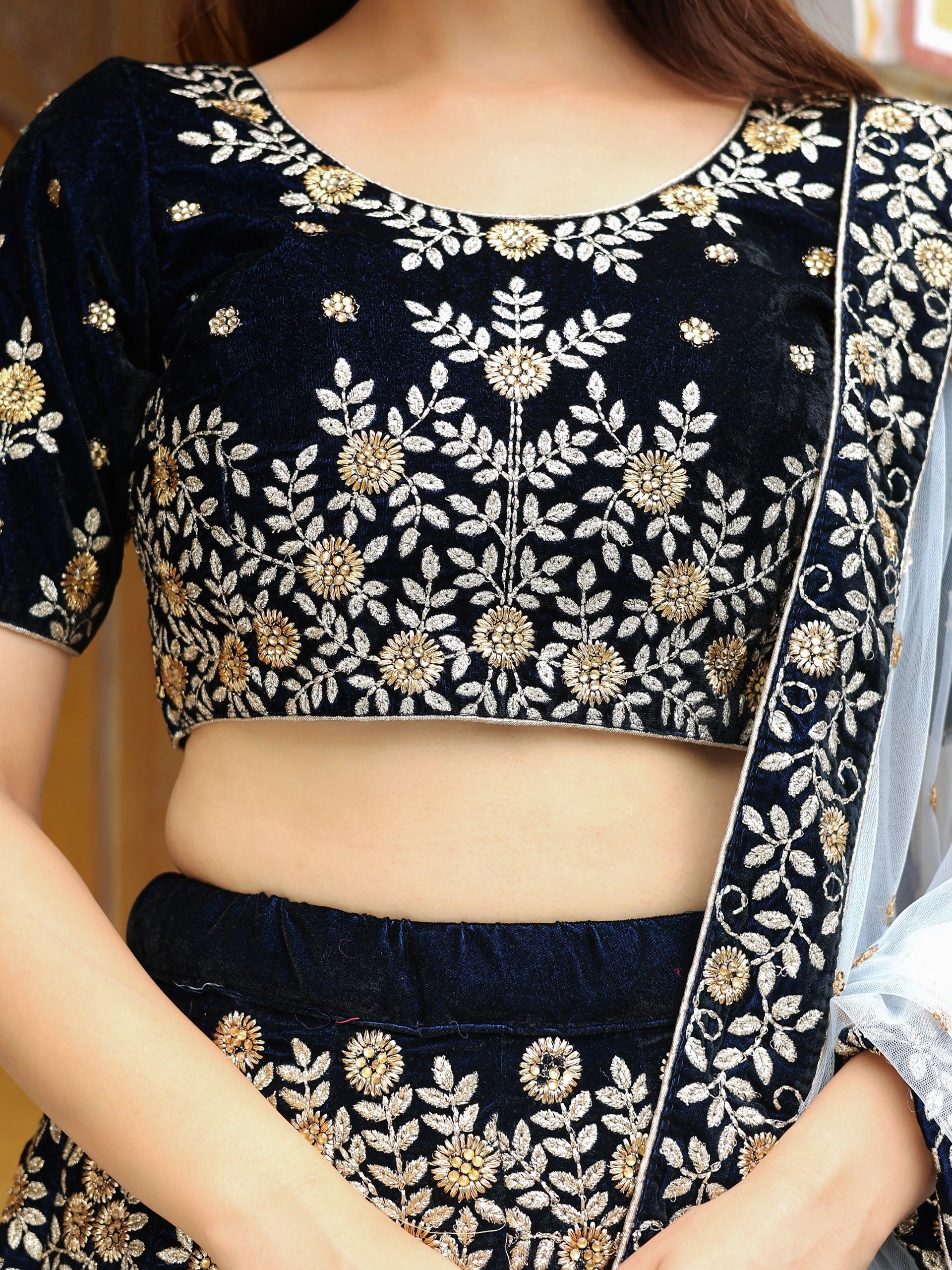 - Work: zari and thread embroidery with fancy stone work