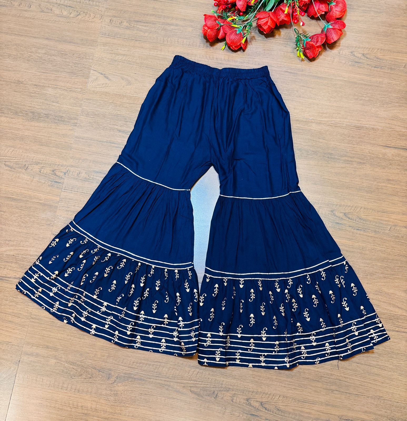 This elegant Sharara Set features a rayon cotton kurti paired with matching sharara pants and a coordinating dupatta. Expertly crafted with intricate embroidery and delicate sequins work, the set is enhanced by a tasteful printed design. Combining comfort with traditional style, it offers a refined look perfect for festive occasions and celebrations.