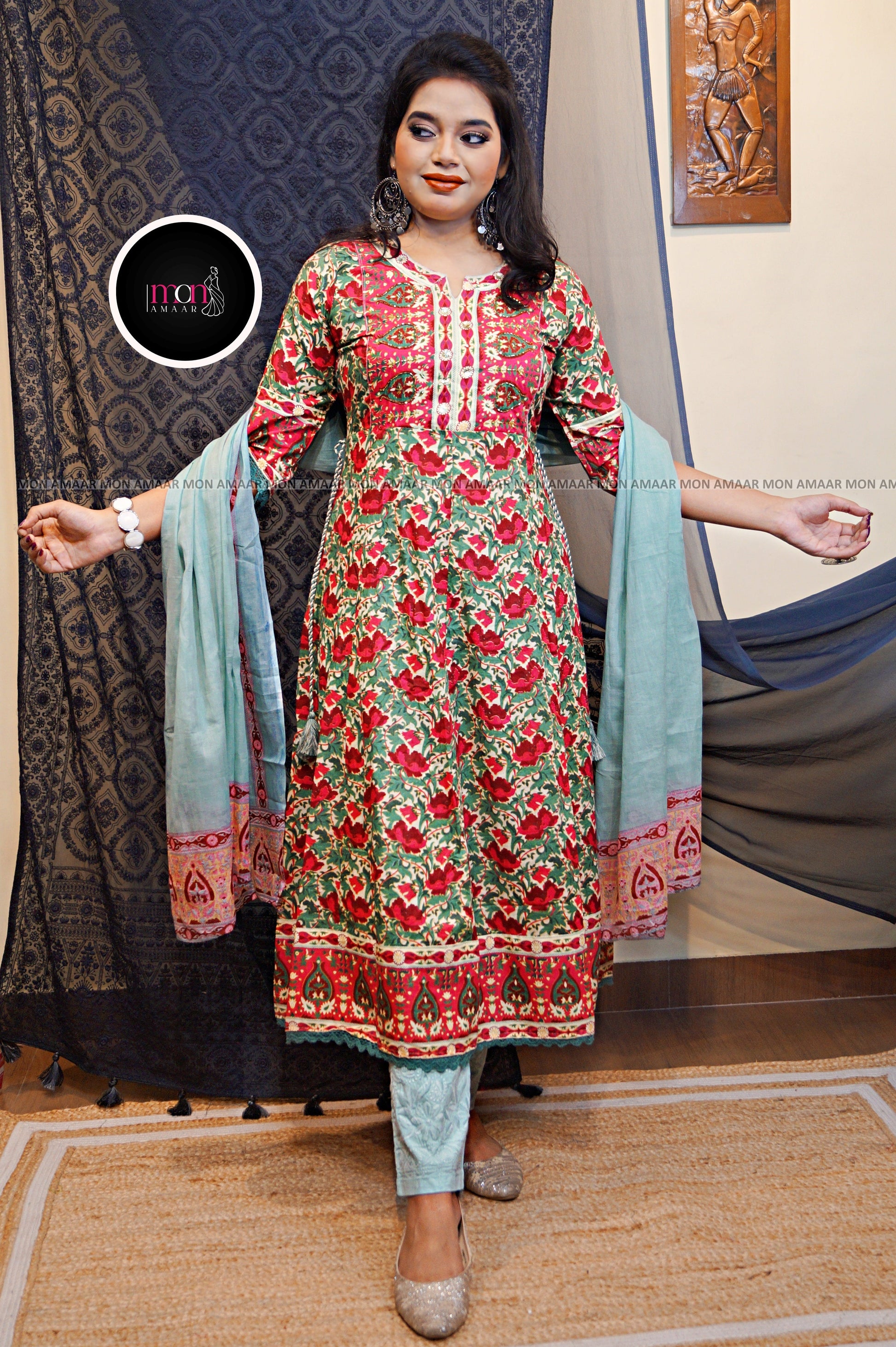 Introducing our luxurious Anarkali Suit Set, crafted from breathable pure cotton and opulently adorned with Embroidery work and prints. This exquisite design is sure to turn heads . A perfect statement piece for the summer season.