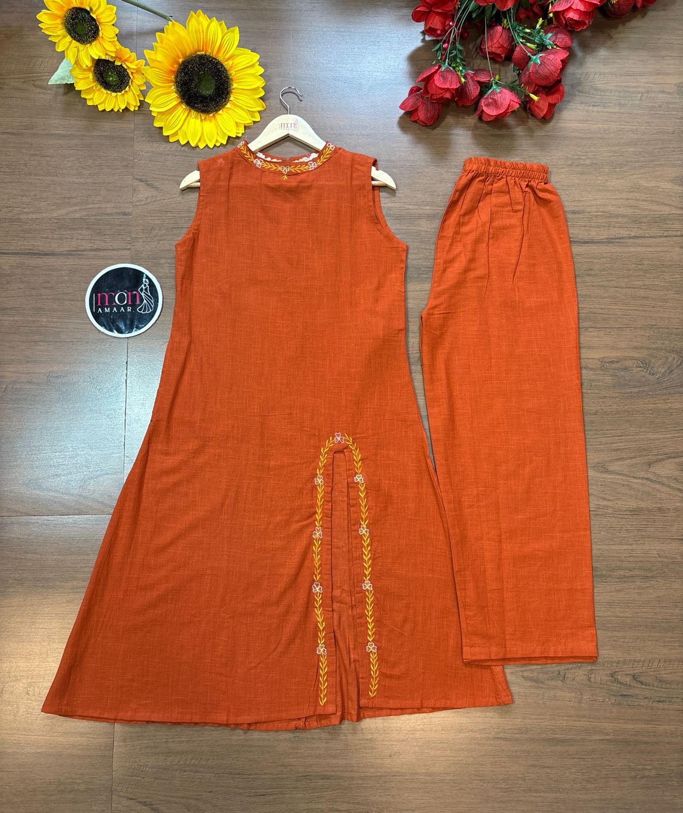 Welcoming our timeless classic for versatile elegance Sweet Festive Cotton Coord Set. This stunning coord set features likes embroidery work that is trendy and gorgeous. Made with high-quality cotton slub , this set is not only cool but also comfortable to wear. Elevate your style game with this must-have set!