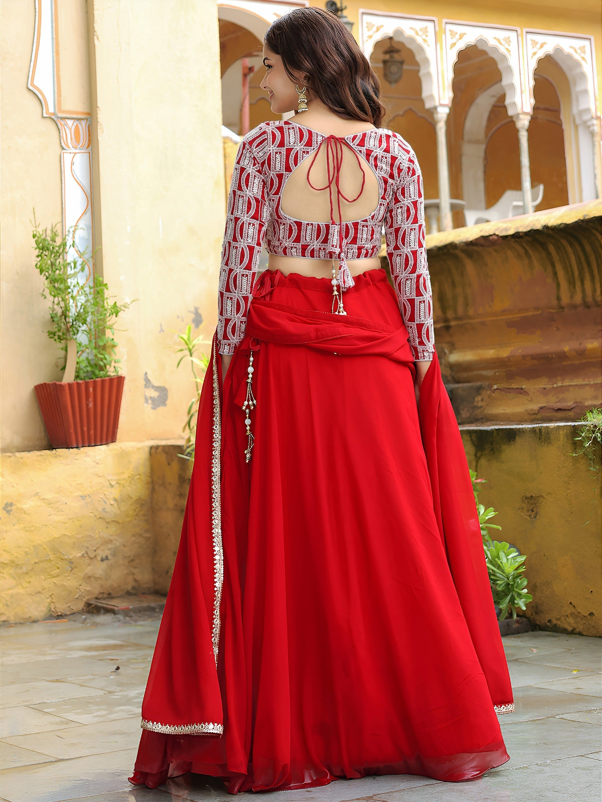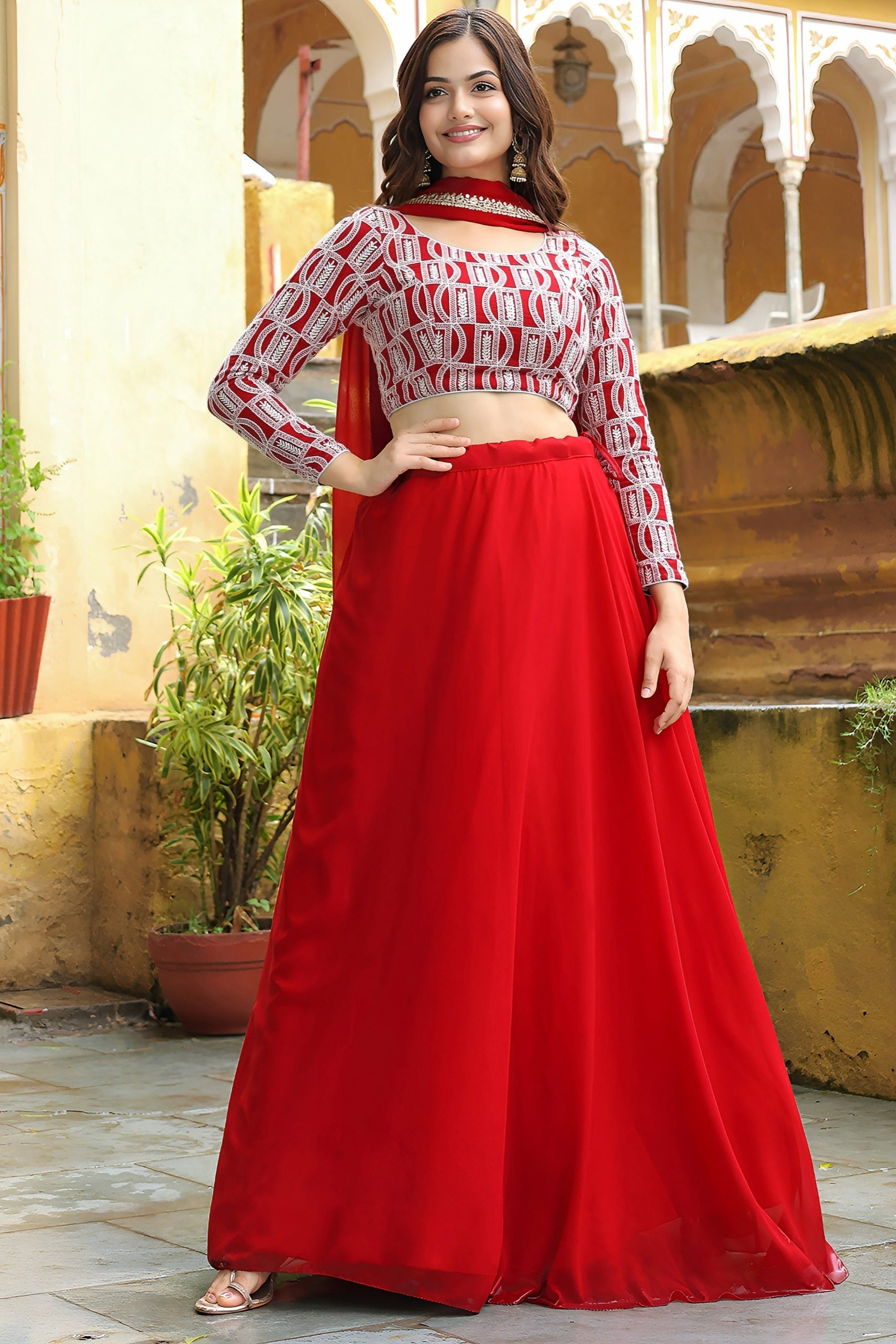 Unleash your inner boldness and stand out in the crowd Designer The Rose Courtyard Georgette Lehenga [fancy] ! These stunning ensembles are rich in color and feature stylish looks, making you the center of attention at every party and wedding. With this fancy silk [ blended ] fabric options to choose from, you can create a trendy and elegant look that is uniquely you. Get ready to stun in these gorgeous lehengas!
